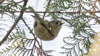 林に入ると混群がいます。換羽でぼさぼさのシジュウカラも記録しておこうと狙いますが、この時期はむき出しの位置に出る時間が短い気がします。暑いこともあるだろうし、換羽でふだんより飛翔能力が劣るのかもしれません。茂っているとき、役立たずになるカメラの鳥認識AFと相まって、なかなか撮影できません。2つめの混群で奮闘していたとき、ふと広く見てみようと思いつきました。葉の揺れを手がかりに鳥を見つけ、双眼鏡で確認します。すると、いました! ムシクイです。野鳥図鑑に「真夏の8月上旬にセンダイムシクイが確認される」と書いた通り。下嘴が一様に明るい橙色、上面は明るいオリーブ色、下尾筒が黄色みを帯びること、時期からセンダイムシクイで間違いないでしょう。秋の渡り初認です。