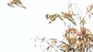 草はらのアオジもいなくなったようです。シジュウカラがぶら下がっている落ち葉のかたまりに何かを見つけて、ぶら下りながら執拗につついていました。飛翔設定にして観察しながら待ちます。しばらくしてかたまりがほぐれたので、それを見た瞬間に飛ぶ!と感じてシャッターを押し、シジュウカラの飛んだ方向を追いました。画面のすみですが、捉えられました。次の動きを読んでいるのでギリギリ反応が追いついています。きちんと観察していないと次が読めないので、飛んだと思ったときには手遅れです。