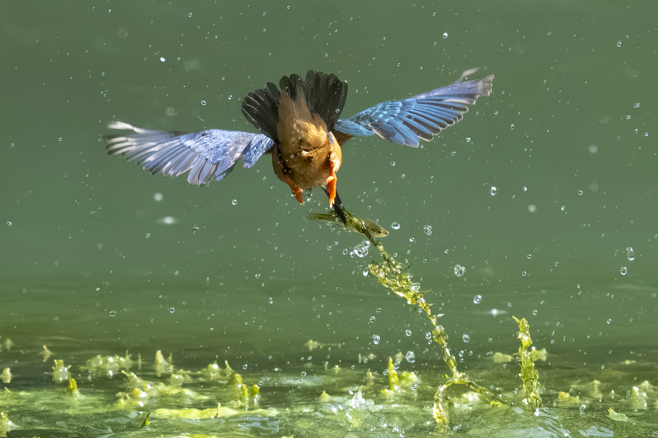 池に出ると、いつものカワセミがいたのでダイビングを狙います。撮影にはまた失敗しましたが、水面から出てきたカワセミはその場でぴょんぴょんと3回もダイビングし直してくれた(!?)ので、さすがに撮影できました。背を向けていましたが。それは水面で跳ねるような謎の行動でしたが、写真を見返すと理由がわかりました。獲物のモツゴに水草がからみ、切れなかったのです。3回目でようやく水草が切れて、飛行することができたというわけです。