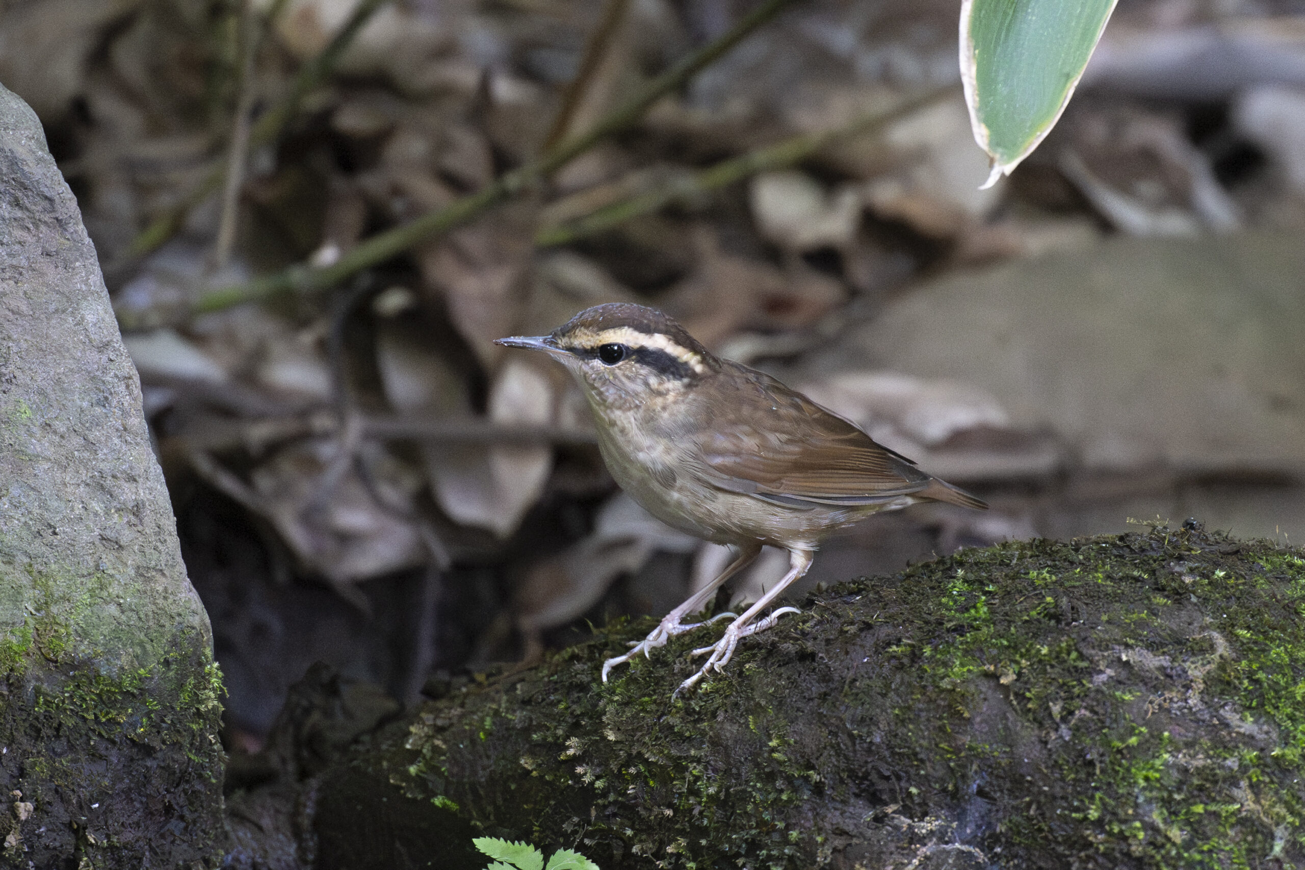 最初の観察地ではキーキキキというツミの鳴き声が、遠くから聞こえました。空を見つめますが、姿は見えません。(池でショータイムが始まったかな)期待しつつ探索を再開しました。今朝も無風に近くて探しやすい条件ですが、混群には行き合えません。丹念に探索して次の観察地へ向かおうとしたとき、「ムシクイ?」「メボソかな?」という友人の声が聞こえました。確認すると、地上を浅いホッピングで歩く鳥がいます。笹やぶに入ったり出てきたり。はっきりした白い眉斑に、上面は濃い茶色で、そして尾羽が極端に短かったのでヤブサメだとわかりました。羽色やフォルムにも特徴はありますが、なによりムシクイは樹上生なので、地上を歩いて行動することはありません。趾(足指)を見ると長くてしっかりしています。樹上生のムシクイの趾と比較してみたいですね。ヤブサメは夏鳥ですから、渡りの途中で当地に立ち寄ったことになります。白いガを採食しているのを見て、渡りの中継地となる市街地の緑地の大切さを実感しました。ヤブサメは、声はすれど姿はなかなか見かけない鳥なので、うれしい観察です。友人に感謝!