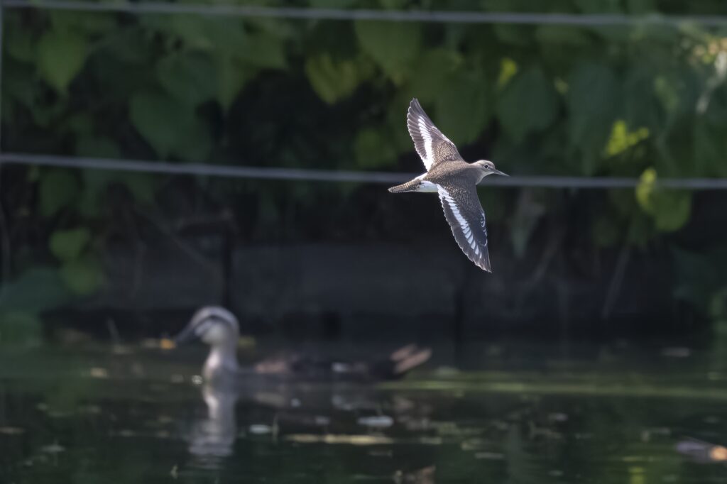 池に降りるといい位置にカワセミがいました。何度か至近にダイビングしたので水浴びだとわかりますが、5回のうち1回だけは小さな魚をくわえていました。ついでに狩ったのでしょうか。観察も終盤で、カイツブリとカルガモだけのさびしい池を確認していると、水面すぐ上をなめらかに飛んでいく鳥が目に入りました。Uターンしてこちらに戻ってきたのはイソシギです。翼の白い帯が特徴的。