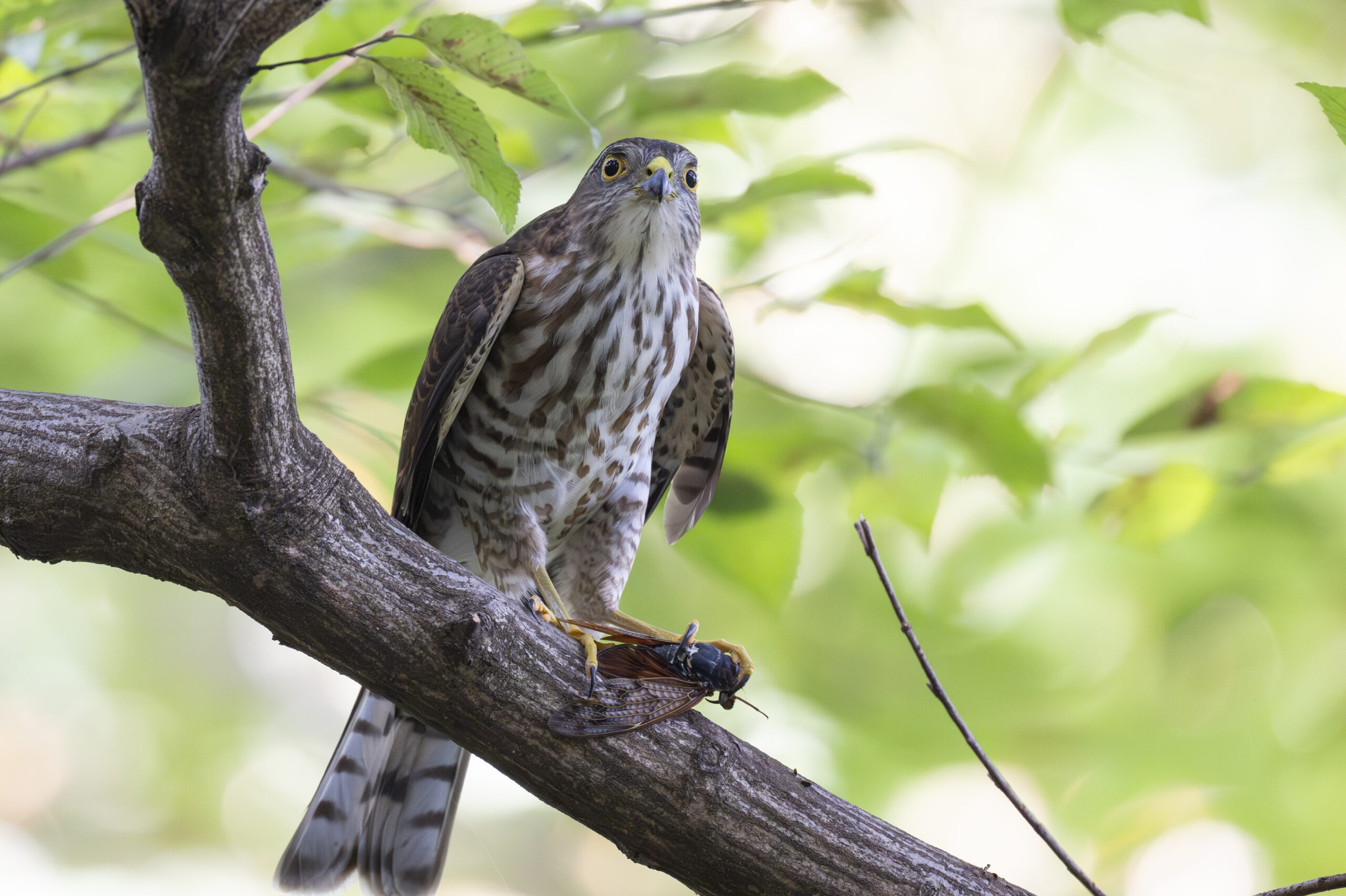鳥の影は少ないですが、冷静に探索を進めます。すると木立の奥の方で、ジグザグに飛ぶハトくらいの大きさの鳥の影が見えました。林内を自在に飛び回る動きはハトではなく、大きさからツミに違いありません。池でインコと「鬼ごっこ」している幼鳥でしょうか。ジグザグの動きは、セミを追っているのではないかと見当がつきます。しばらくして、セミをもっている!という声が聞こえ、思わずニンマリしました。ツミはセミをもって枝にとまりますが、逃げられてしまいます。それを空中で器用に再捕獲し、枝にとまりました。でも、すぐにまた逃げられてしまいます。幼鳥なので、未熟なのでしょうか。そんなドジ?を10回も繰り返しているうち、わたしたちの近くに来ました。茶色で不透明な翅から、アブラゼミだとわかります。ツミはセミをしっかり握っていますが、また逃げられてしまいました。いや、待てよ。これは逃げられているのではなく放しているのかも、と思い直します。いくら未熟でも、鋭いつめがあるタカの足指です。一回二回ならまだしも、十数回も続くのはおかしいですね。結局ツミは「キャッチアンドリリース」を20回ほど繰り返したあと、アブラゼミを食べ始めました。ツミの幼鳥がセミを捕らえることは知られていますし、いずれ小鳥を捕らえる狩りの練習になるということは著書にも書いています。でも、みずから「キャッチアンドリリース」を繰り返して狩りの練習をすることは知りませんでした。興味深い観察ができてたいへんうれしい朝でしたが、井の頭池にカワウの姿を見つけられず、残念な気持ちになりました。