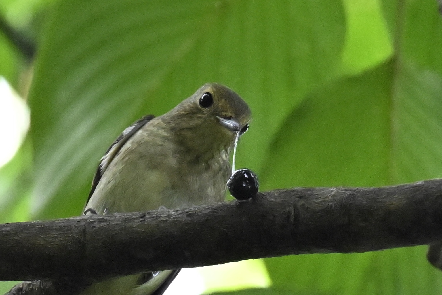 探索を進めますが、大型ツグミは今朝も見つからず、目ぼしい発見はありません。定点の一つでじっと目を凝らしていると、小鳥の群れが近づきつつあるのが見えました。確認するとヤマガラの小さな群れで、追いかけあったりしてからみながら、エゴノキの実を採食しているようです。しばらく見ていると、シジュウカラもいることがわかり、次いでキビタキも見つかりました。群れには流れがあるもので、しばらく待っていると、キビたんは頭上にきました。そのまま動かず、もぞもぞしているように見えたので、種を吐くことが予想できました。観察していると、もぞもぞはもごもごになり、ミズキの実を吐き戻しました。種を吐いたのではなく、実を丸ごと戻したのです。キビたんは戻した実をくわえ、枝の上に置きました。嘴からは唾液?消化液のような分泌物が糸を引き、実はすぐに落ちませんでしたが、糸が切れると落ちました。うーん、ちょっとだらしない場面だったなあ笑