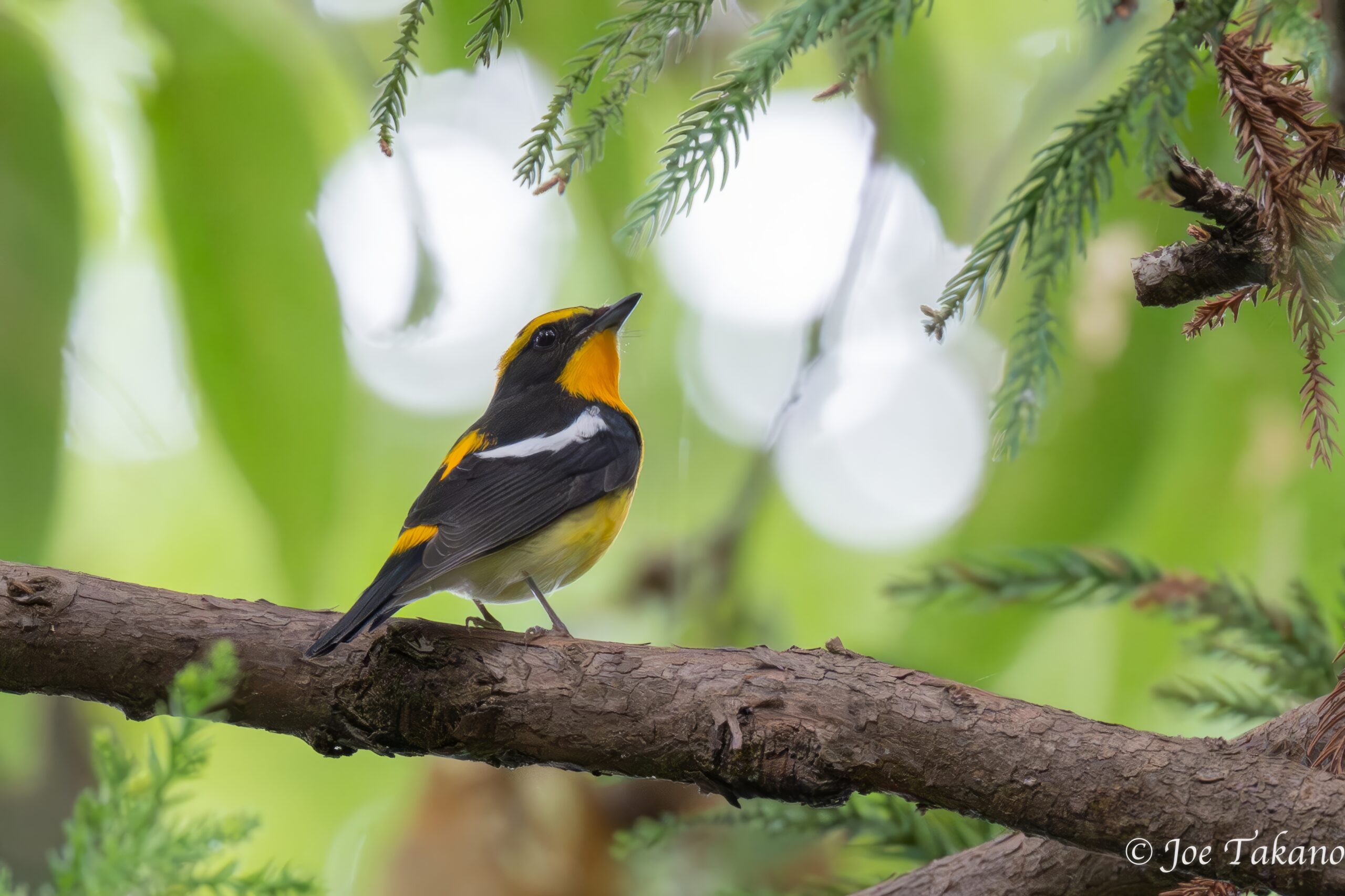 林に入り、本格的な探索を始めます。すれ違った友人から水場がヒタキ類でにぎわっていたよ、なんて話も聞きますが、わたしは情報に基づいて動くのではなく、あくまでも自分で見つけたいので直行はしません。あとで通りかかったときにようすを確認すればよいのです。毎朝の観察ポイントを確認していくと、園路を右から左へ水平に飛んでいく鳥の影。ミズキの木を横切るとき、パシッと実を採っていったように見えました。長い飛距離を根性で追い、とまった位置を双眼鏡で確認すると、見目麗しいキビタキのオスでした。そのくちばしは実をくわえていませんでしたから、ミズキの実のフライングキャッチは失敗だったようです。キビタキが飛んできた方にはエゾビタキもいたのですが、カラス数羽が乱入してきて騒いだのでどこかへ逃げてしまいました。林のようすは昨朝と同じ感じで、キビタキの小さな群れが追いかけっこをしながら虫やら果実やらを採食。秋の渡りらしい観察でした。