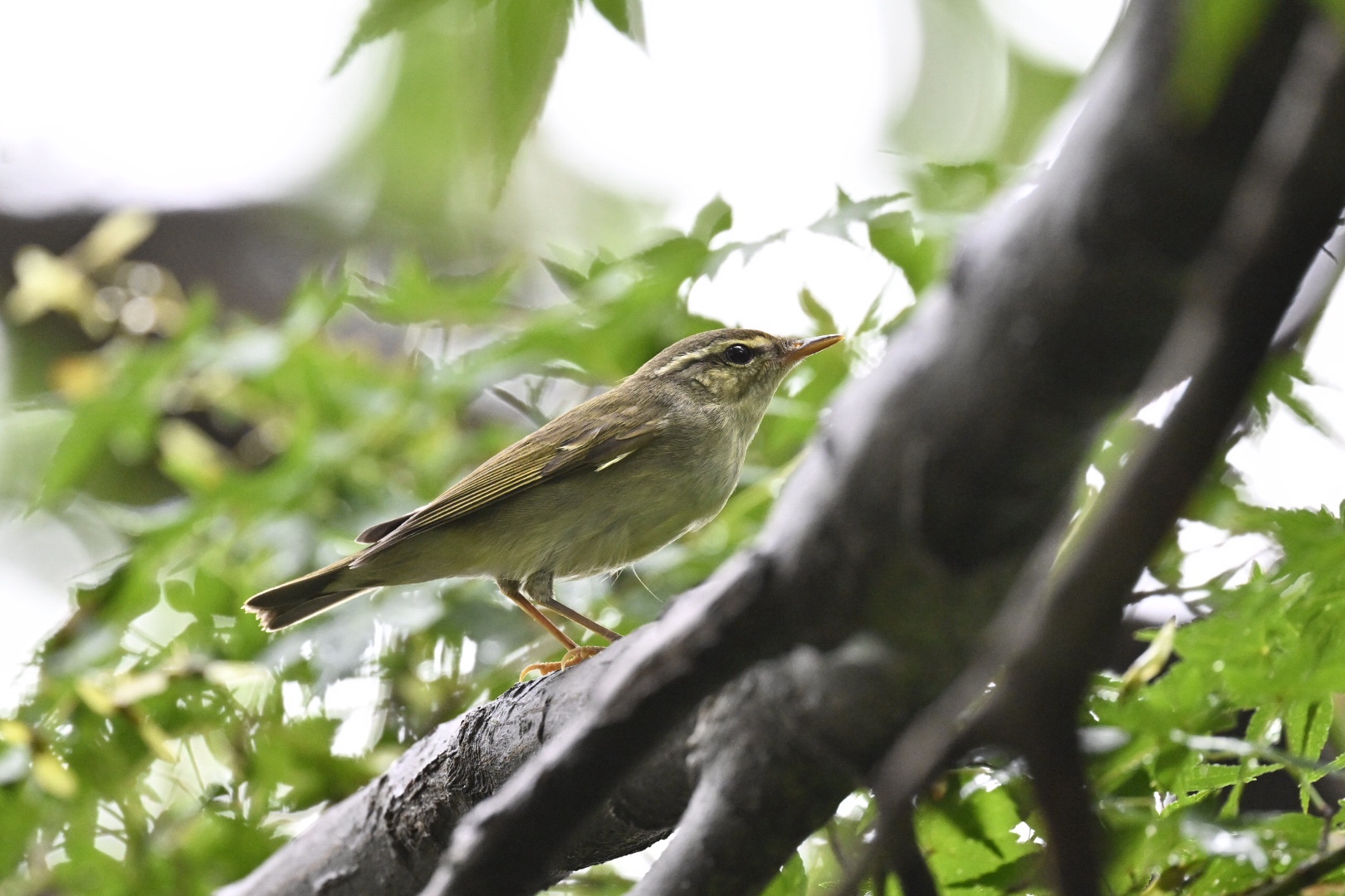 最初の観察地は小鳥たちが激しく動き回り、大にぎわい。鋭く飛んで枝にとまり、細かく動かないのはヒタキの特徴。立つようなシルエットに見えます。確認するとキビタキでした。周囲にはコゲラ、ヤマガラ、シジュウカラ、エナガ、メジロがたくさんいて、その中から渡り鳥を見つけるのは大変です。不意にシルエットが細身の鳥が見えたので双眼鏡で確認すると、ムシクイでした。素早く動き回るのでなかなかはっきり観察できませんでしたが、ピチッという声はメボソムシクイかオオムシクイの地鳴きです。その後、やや小さい声量でチョッチョリ チョッチョリとぐぜってくれたのが聞こえたので、メボソムシクイだとわかりました。記録写真を撮ろうとしますが、ほとんどシジュウカラやエナガ、メジロという大混群の中から数少ないムシクイを探すのはなかなか骨が折れます。集中して目を凝らしていると、蚊が顔にたかってきて邪魔をしてくれます。集中しようとしているときに邪魔されると腹が立つもので、わたしは強力な虫よけをたっぷり手に取り、顔と首にしっかり塗り込みました。身体には悪そうですが、これで邪魔はされなくなり、観察に全集中できます。その後、メボソムシクイとキビタキを何度か確認、観察することができました。