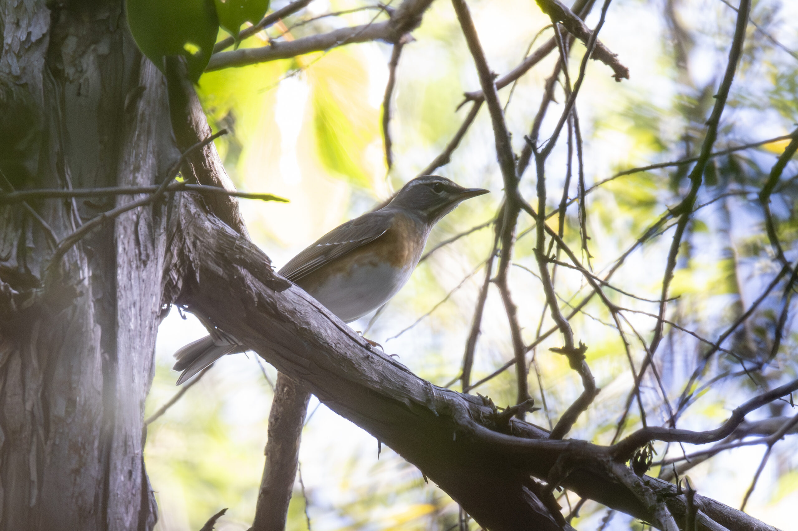 林の中心部ではカケスが鳴いています。本来のジェーという声よりも、違う声で鳴くことのほうが多い印象でした。このブログ用に記録写真を撮りたいのですが、移動してきたばかりのカケスはシャイで、なかなか姿を見せてくれないものです。動きは見えているのですが、写真を撮れる位置にとまってくれませんでした。そこに時間を使っていられないので、ほかを探すことにします。定点で立ち止まって目を凝らすと、たまにキビタキが見つかりました。ヒッ ヒッ ヒッ クルルクルルの地鳴きも聞こえます。最近の傾向通りですね。キビタキらしき動きを見ているとき、ひと回り大きな鳥の影が動くのが見えました。とまった位置を双眼鏡で確認するとツグミ属だとわかり、顎線が見えました。一瞬、うわさのシロハラ初物だと思いましたが、胸は橙色なのでアカハラだと思いました。それも一瞬のことで、はっきりした眉斑を確認し、マミチャジナイだとわかりました。
