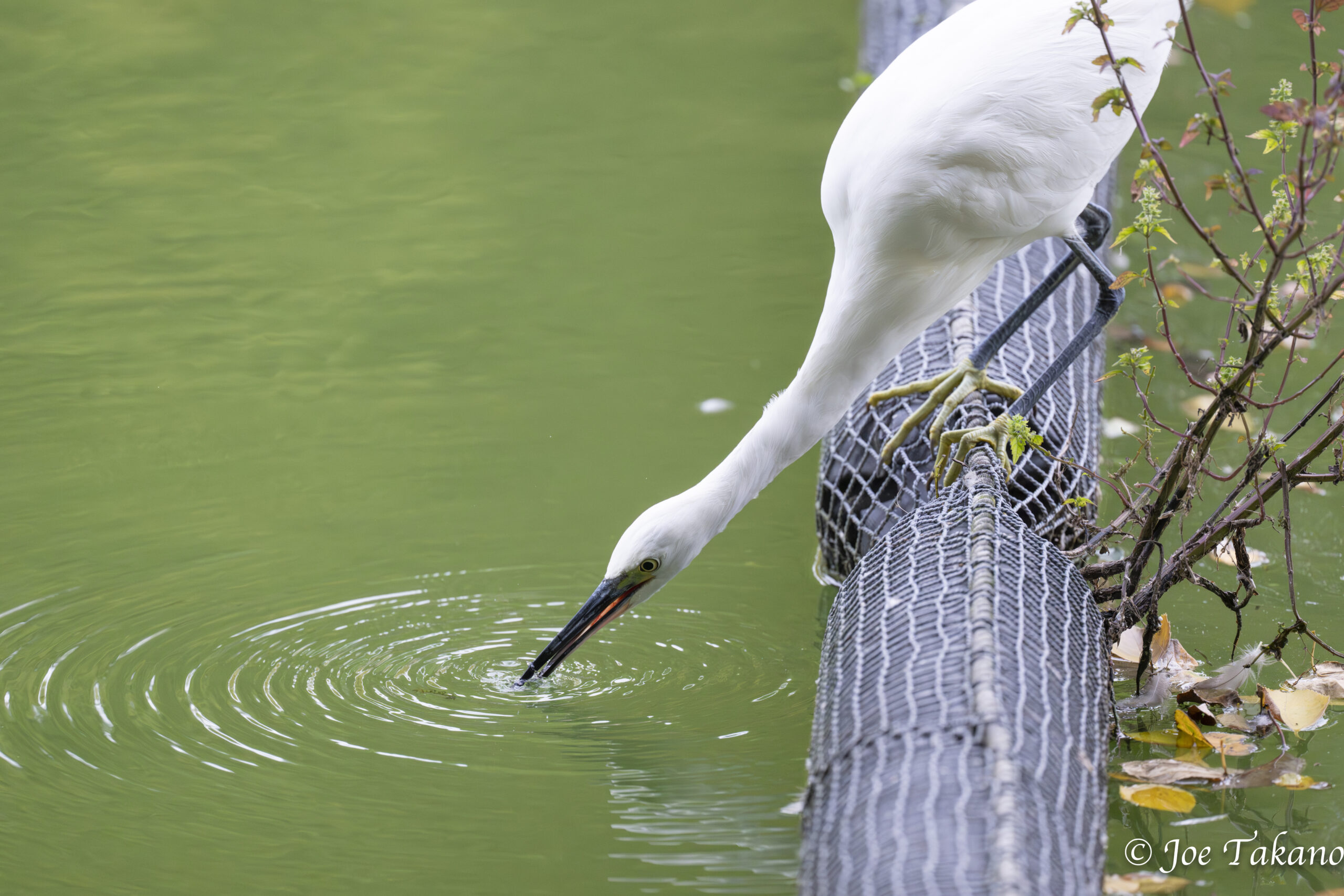 渡り鳥は撮れませんでしたが、あとの予定もあったので林はあきらめて池へ降りることにしました。定点で振り返っても何も飛んでおらず、大阪万博より少し早く「鬼ごっこ」が閉幕した池は静かでした。遠くからこちらのほうへ飛んでくる鳥が見えたので、手元でカメラの電源を入れて起動し、構えました。コサギがジグザグ飛びながら、池を仕切るネットの上にとまりました。同じ飛び方をしてくれないかなと思い「離陸」に備えましたが、落ち着いたようでした。近くにはヒドリガモもとまっています。その近くを通り過ぎようとしたとき、コサギが水面にくちばしを近づけて構えていました。これは!と直感し、カメラを向けて観察していると、くちばしを水面につけてブクブクし始めました! いつか観たい撮りたいと願っていた「波紋漁法」です。『身近な野鳥の観察図鑑』のコサギのページで紹介した行動で、くちばしを水面につけて波動を起こすことで、魚を誘引して捕食する狩りです。まったくの推測ですが、水面で振動(波動)を起こすことで、ターゲットの魚をだましておびき寄せ、寄ってきたところをパクっとやるのでしょう。魚にとってはコサギが起こす波動が、水面に落ちた虫がもがいているように錯覚するのでしょう。読みが当たったことで、波紋を起こすところから、捕食に成功するまでの一連の場面を撮ることができました。夏に熊本で撮影に成功したササゴイの「投釣り」に続く成果です。やった! この動画は編集中の図鑑に使うことにしましょう。その後もコサギは波紋漁法を繰り返しましたが、熊本のササゴイの「釣り」に比べると成功率は低く、20回行って2回成功というところでした。でもとにかくコサギもササゴイも、知恵と行動で採食の成功率や効率を上げる賢い鳥だということは間違いありません。興味深い観察ができてうれしい日でした。