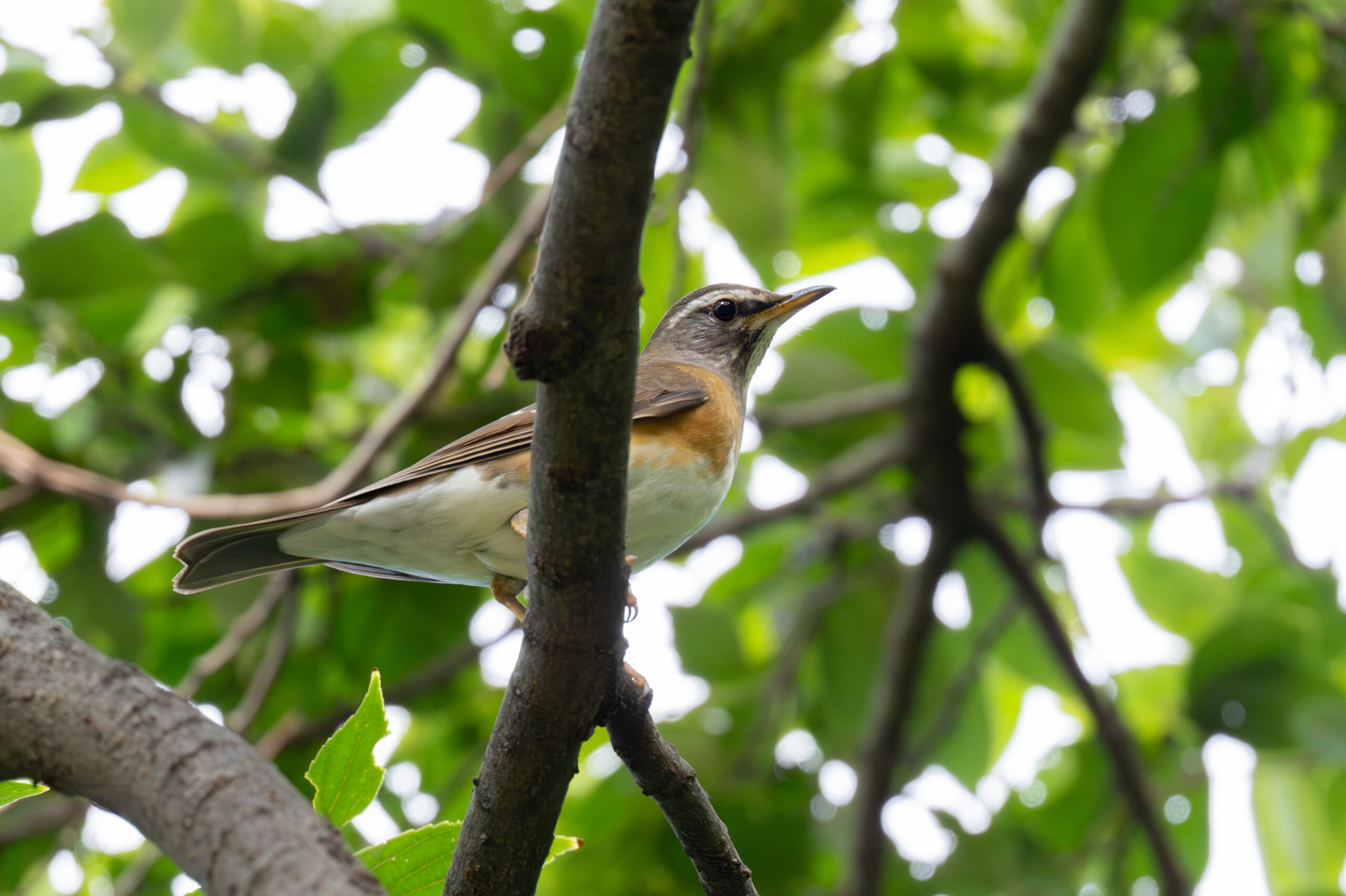 次に毎朝確認を欠かさない旬のミズキへ。キビタキやメジロが数羽ずついました。鳥は動き回るわ、光は変化するわで苦戦していると、ひと回り大きなヒタキがきました。上尾筒から尾羽にかけて赤みが見えたので、はじめはオオルリのメスだと思ったのですが、風が吹いて葉に隠れている部分が見えると、ジョビ子のようです。葉隠れながら、尾羽を震わせるジョウビタキならではの動きで確認できました。ミズキから少し離れたムクノキあたりからはツグミ属の声。先ほどの群れかもしれません。ムクノキの実を食べに来たかーと確認しに行きましたが、姿は見つかりませんでした。
