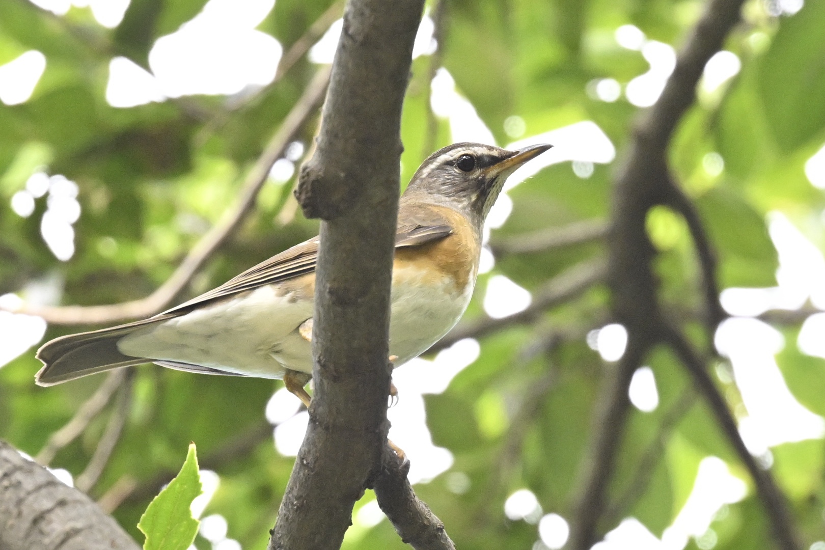 ジョビ子が去り、キビタキとメジロの動きに新たな展開がなさそうだったので移動しようと思いましたが、アカハラの群れが気になったので、とどまることにしました。すると、声が近づいてきて、ついにミズキに現れました。ただ、葉隠れです。ミズキの実は葉の上につくので、木を見上げていても、鳥が見えないことが多いのです。アカハラは隠れた状態で実を採食すると、近くの茂った位置に隠れてしまいます。しばらく待つと再びやってきますが、数分から10分以上待つことになります。わたしは粘ることにし、葉隠れを見送ることにしました。かぶっている枝や葉を外そうとあがくと、鳥が逃げるからです。じっと待てば、チャンスはやってきます。そうして粘ること40分。見える位置にとまってくれました。その個体にははっきりした眉斑があります。マミチャジナイでした。アカハラとマミチャジナイの混群だったのです。それにしてももうすぐ11月。ムクノキではなく、未だにミズキを食べているというのは、少しスケジュールが遅れているのではと思いました。