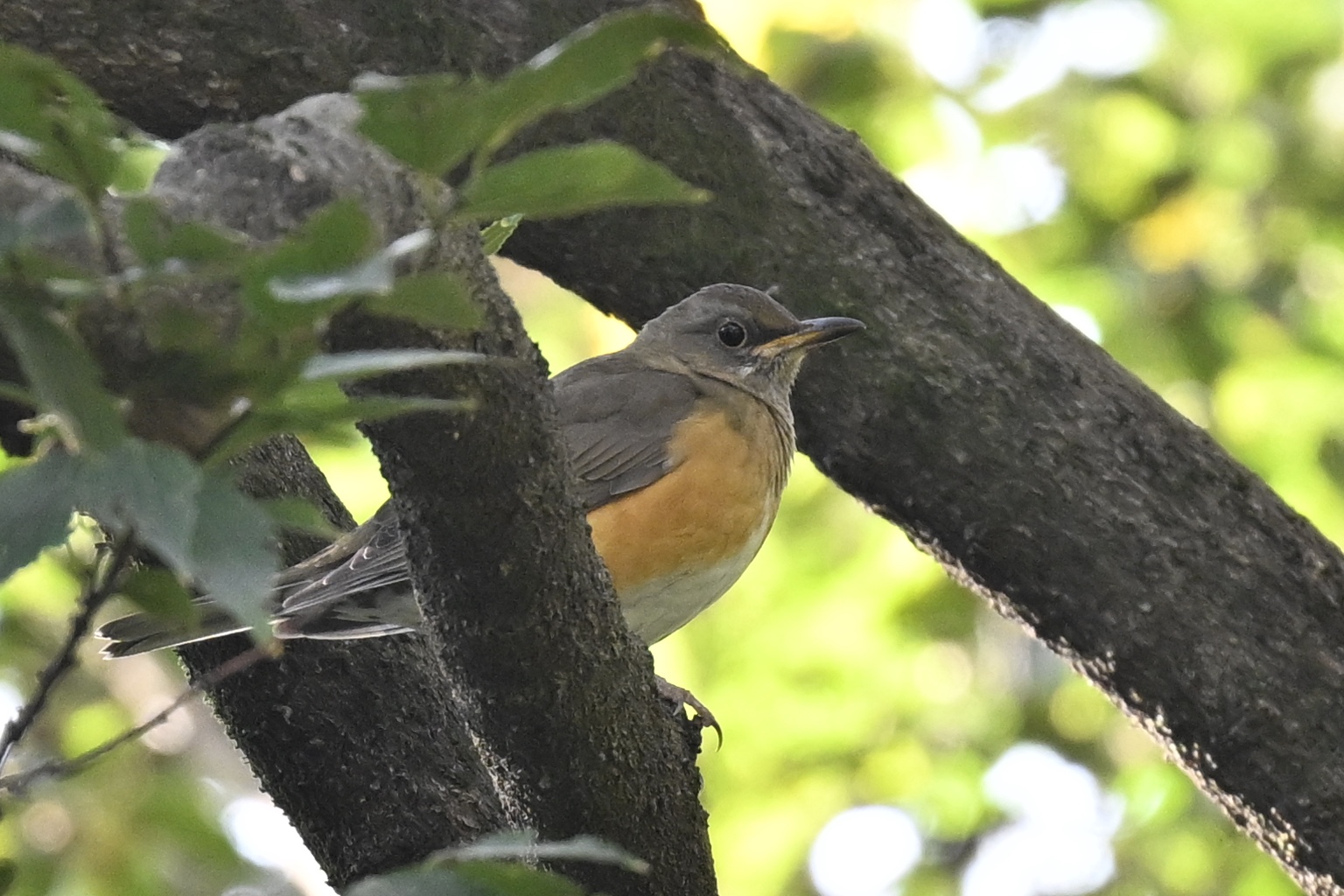 アオジかクロジの声が聞こえ、笹やぶに降りる一瞬も見ましたが、姿は捉えられません。キビタキの姿も見えず、今日はダメな日なのかなと考えます。ツィーッの声でムクノキの実を食べるツグミ属を想像して見上げると、アオバトがとまっていました。お尻を向けてじっとしているので、観察にはなりませんでした。時間を取ったので中心部を2周しましたが、キビタキの姿も見つからないままでした。諦めずに探索を進めると、ジュリンという声。マヒワです。構えていると、ヒノキ林から3羽が飛んできましたが、これを撮り逃しました。なおも粘り強く探索を続け、ようやくキビタキとアカハラの姿を捉えました。