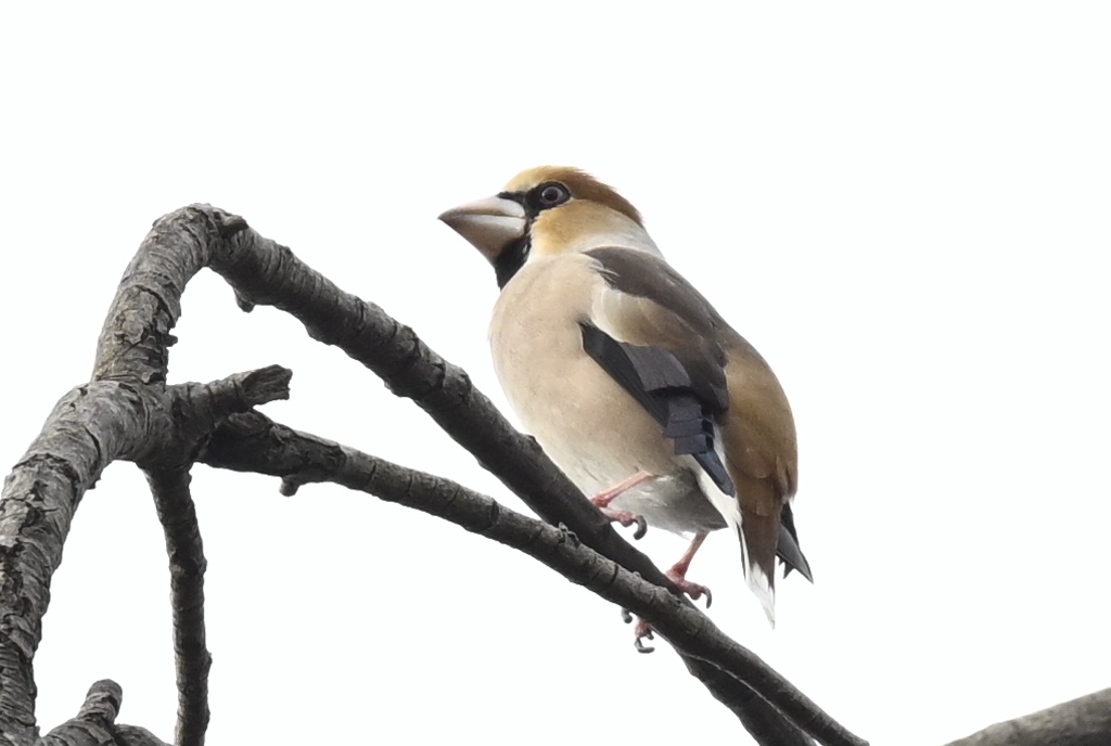 住宅地ではシジュウカラが多い印象でした。最初の観察地では、ヤマガラはエゴノキの実を採食し、シジュウカラは地上に降りています。観察すると、やはりチュウゴクアミガサハゴロモをくわえていました。鮮明な写真がなかなか撮れないので、少し狙ってみます。それで、地上に降りた瞬間にはすでにハゴロモをくわえていることが多いことがわかりました。うすうすは気づいていたのですが。観察不足で確認が取れていませんが、樹上から虫を見つけ、地上に降りて捕っているのだと予想できます。一方、地上をホッピングして探索する動きも見られますし、樹上でも捕らえます。いろいろなケースがあるのでしょうが、ハゴロモ自体の生態も含め、もっと観察が必要です。移動しようとすると、キーン キーンという声が聞こえました。振り返ると高木の梢にずんぐりした体形の小鳥がとまっています。ピチッ ピチッと鳴いたのはシメで、今シーズンの初認でした。シメは高い位置を飛び回ったあと、去りました。