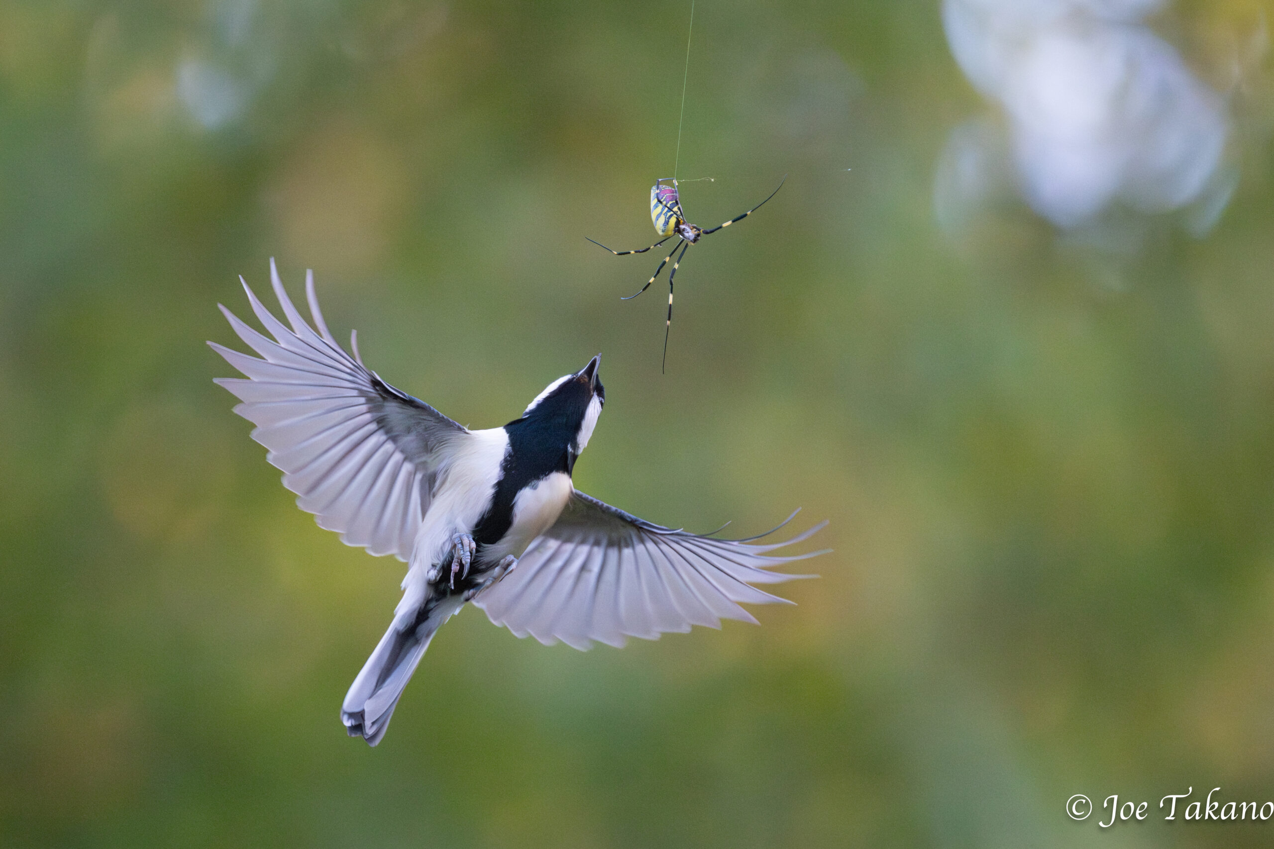 6時台は暗いですね。最初の観察地では、シメ数羽の小さな群れが上空を飛んでいきました。まだ暗くて肉眼での観察がつらかったのですが、シジュウカラの群れが地上に降りているのが見えます。ずっと続いているハゴロモ捕食を観察し、地上に降りている個体がハゴロモを見つけてくわえる場面をはっきり確認できました。やはりハゴロモ捕食にもさまざまなパターンがあるのですね。いつもの子たちは活発に動いていますが、渡り鳥は見当たらないので、時間を考えて次に移動しようと思いました、そのとき、シジュウカラのホバリングが見えました。その先には糸でぶらさがっている虫が見えたので、双眼鏡で確認するとジョロウグモでした。ホバリングしながら捕ろうとして失敗した(というか、ジョロウグモを確保できないまま、ホバリングに疲れてやめた)ようです。こんな大きな獲物を捕れるのかなと思いつつ、もう一度捕ろうとするかもしれないと予想して、ジョロウグモにピントを合わせます。とにかく暗いので、ISOを6400まで上げても、小鳥の飛翔を停めるのにほしい1/4000は切れません。1/2000でなんとかと妥協しました(それでもまだ暗い写真です)。ほどなくシジュウカラが飛んできてホバリングし、おいしくいただきました。生きものの次の動きを予測して備え、図に当たる。快感のひと言です。この朝撮りの画像をこのあとの講演で披露することもできます。