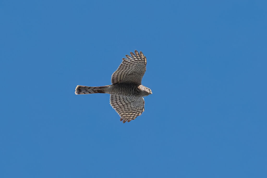 少し空が見えるところで上空を帆翔するハイタカ属に気づきました。少し前に友人がオオタカを確認していたので、写真を撮っているときはオオタカだと思っていましたが、あとで写真を拡大して確認してみるとハイタカでした。これも当地では冬鳥ですね。