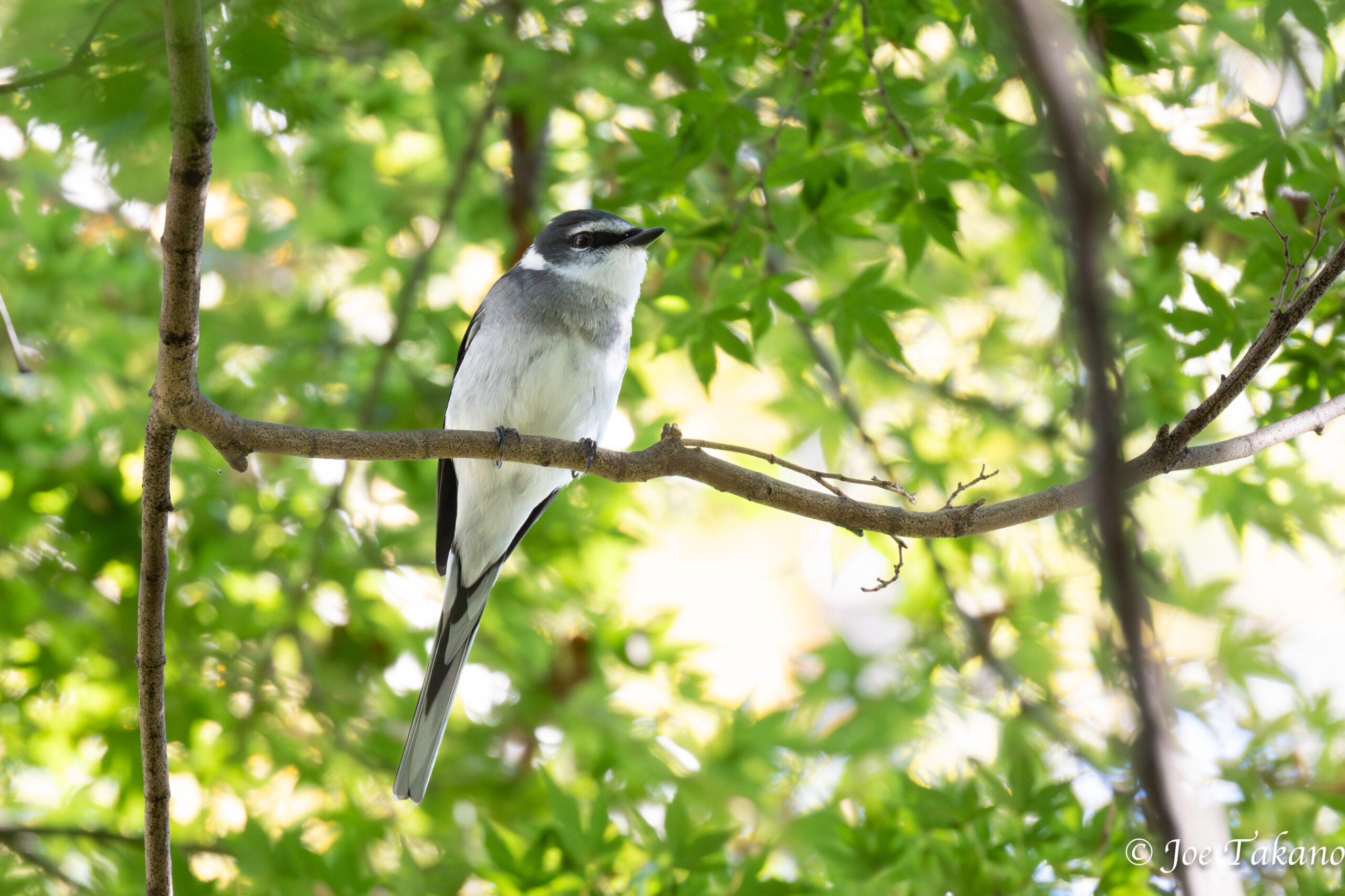 観察を始めてから3時間が経過していたので、さすがに疲れて集中力も低下してきました。ポイントを確認しながら池へ向かって進んでいると、ピュルリーピュルリーのにぎやかな合唱が聞こえました。リュウキュウサンショウクイです。声が四方から聞こえるので、数個体いることがわかりました。イヌシデの枝が混んだ中の高い位置にいたので、なかなか見えません。その後少しずつ移動していき、最後はイロハモミジの比較的低い位置にとまってくれたので、仲間とともにしっかり観察できました。