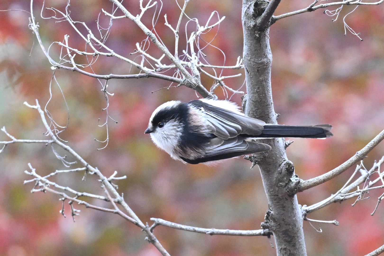 池のほとりで目新しいことはありませんでしたが、イロハモミジに別の混群がいました。観ていると、シジュウカラがまたもアミガサハゴロモを捕食しています。このイロハモミジは例年より色づきが早いようです。その彩りを背にしたエナガが素敵でした。