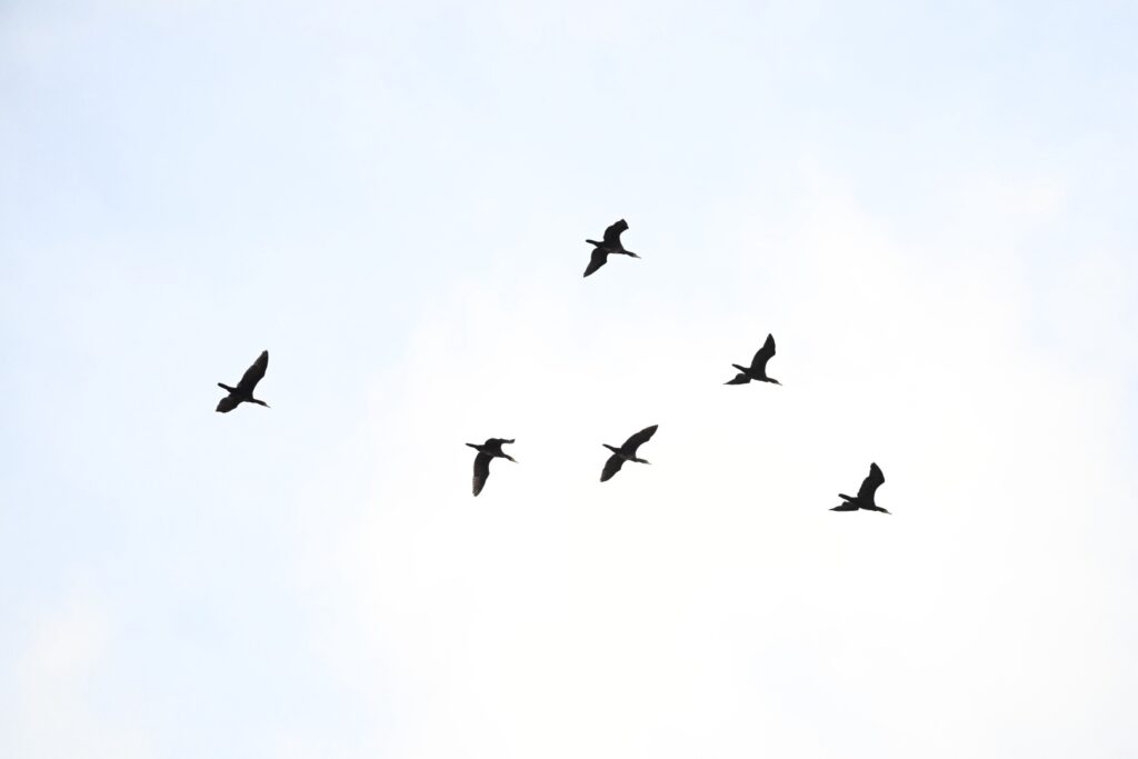林でもツグミは目立ち、頻繁に上空を飛んだり、高木の梢にとまって鳴いたり。シー シーと鳴いてシメも飛んでいきました。飛翔写真をと空を見上げていると、カワウが6羽、雁行形態で飛んでいきます。これが今日の観察の締めくくりと関係しているかもしれないことは、この時点では気づきませんでした。