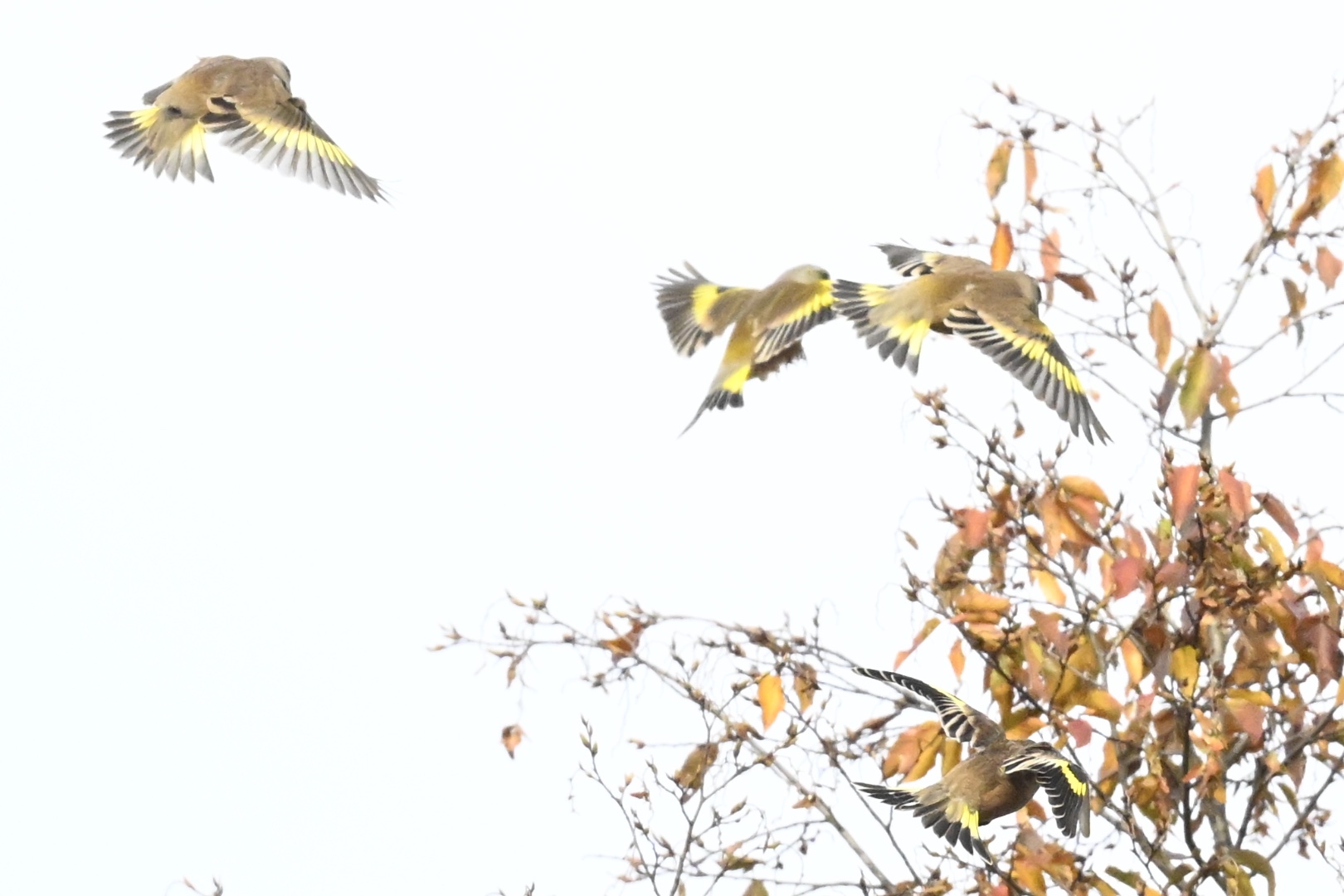 開けた場所にはカワラヒワがわんさかいました。変わらずシデの実を食べていて、翼が降り落ちて雨が降っているような音が聞こえます。頭上に数十羽、離れた木立に数十羽、さらに飛んでくる個体も少なくなく、全体で150羽はいるでしょうか。ときおり、一斉にヒャヒャヒャと声を出しながら飛び立ち、また戻ってくることを繰り返していました。