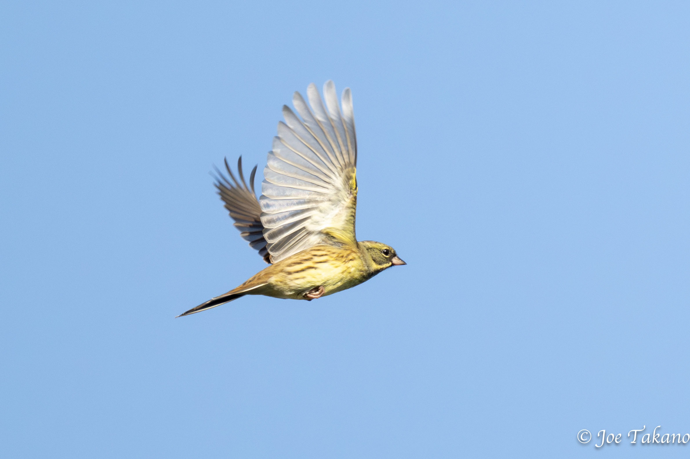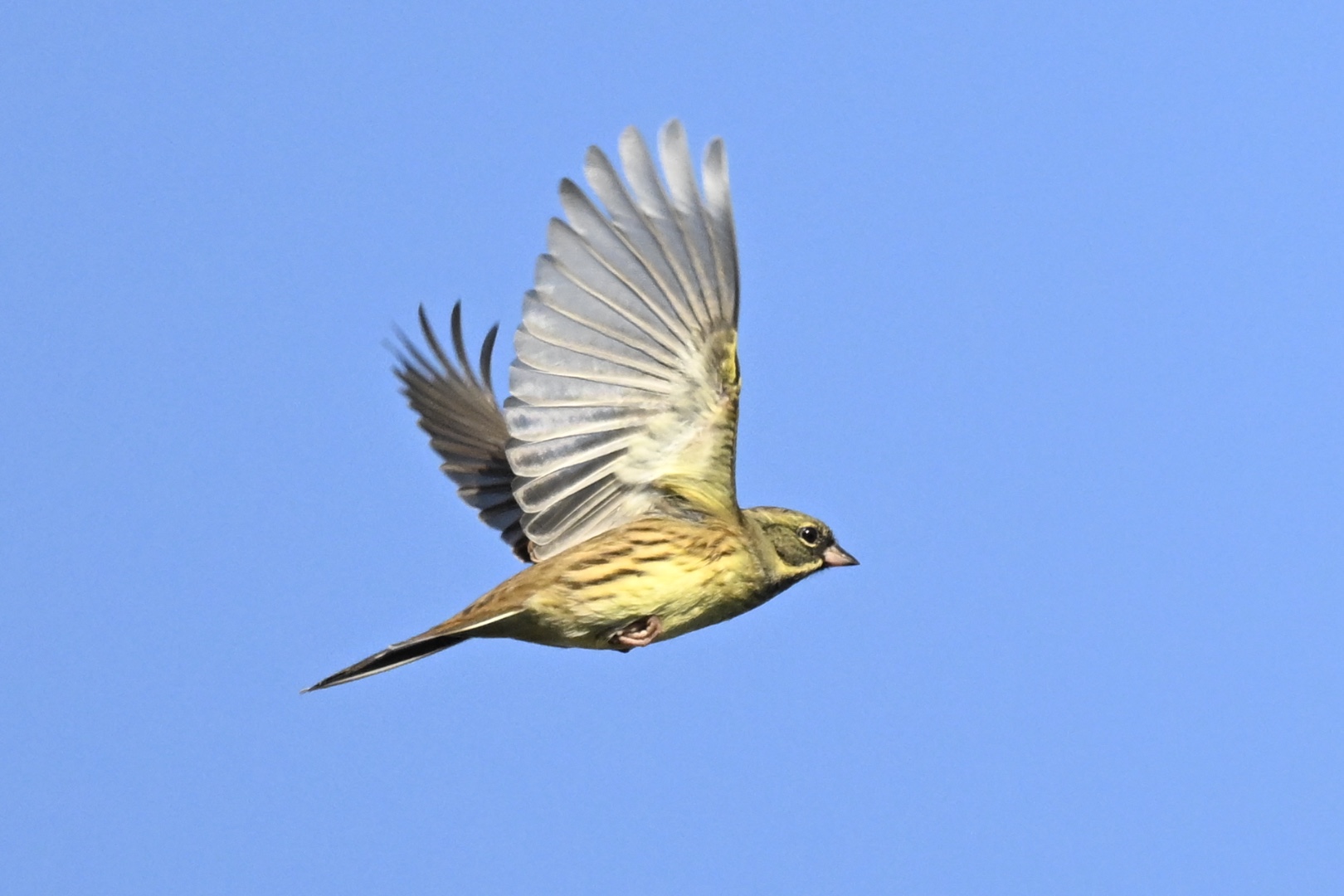 あまり鳥が見られなかったので気分が下がっていましたが、たまにお会いする留学生のマヘサさんと話をしていると、アオジがやぶから木の上に上がってきてご挨拶。飛翔も見せてくれました。