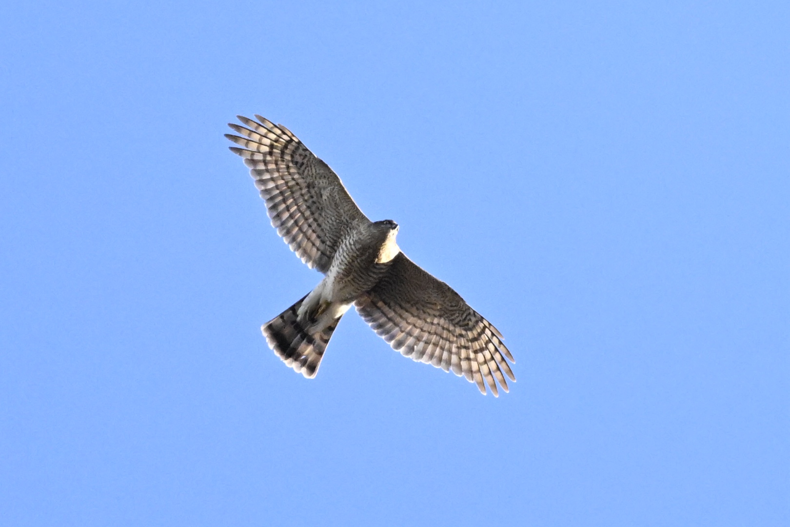 住宅地は静かで、鳥の気配といえば遠くでハシブトガラスが鳴いたくらいでした。スズメは寝坊でしょうか。最初の観察地に鳥は少なく、比較的静かです。次に移動を始めると、上空をタカが帆翔しているのに気づきました。澄んだ青空に浮かんだオオタカは朝日を受けて、神々しく見えます。羽ばたきが多いのは、上昇気流が足りないからでしょう。オオタカはある程度上昇してから吉祥寺駅方向へ滑空して去りました。