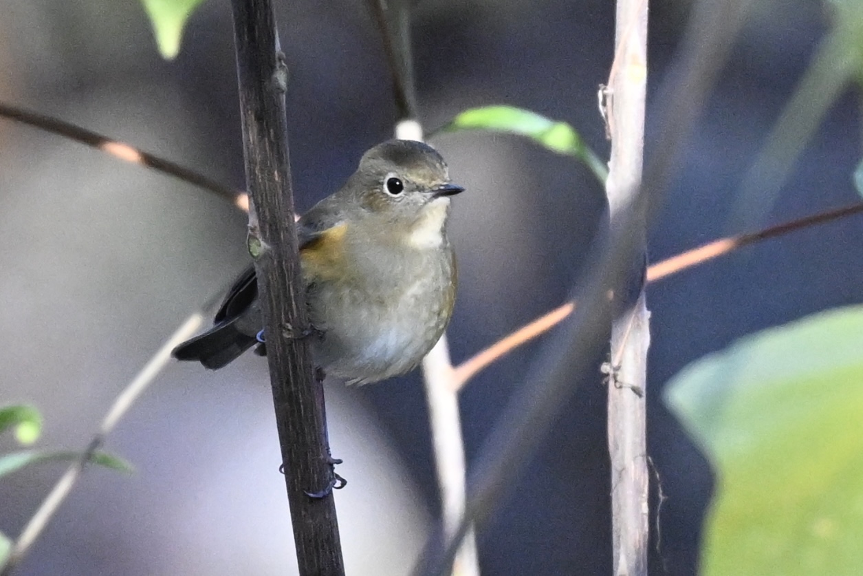 収穫なく探索を進め、カワラヒワ軍団が朝食をガツガツ食べているのを眺めます。ふと、小鳥がスッとイロハモミジにとまったのが見えました。よし、紅葉したモミジと小鳥の組み合わせだ!とファインダーを覗くと、ルリビタキでした。ルリ子は向こうを向いていたので、(こっち向いてー)と心の声を送りましたが、そのまま飛び去りました。みると、ヒサカキの実を採食しています。ひと粒ふた粒くわえ、玉川上水の暗がりに入っていきます。しばらくすると、今度は真っ赤になったイイギリに上っていき、ひと粒くわえましたが、ヒヨが黙っていませんでした。ルリ子は再び上水の中へ。そんなようすを高台から観察。しばらくすると、再びヒサカキの実を食べました。で、上水へ。玉川上水が逃げ場所・隠れ場所となっているのを示してくれているようでした。このまま居着いてくれるとよいのですが、こればかりはルリ子の気分次第です。