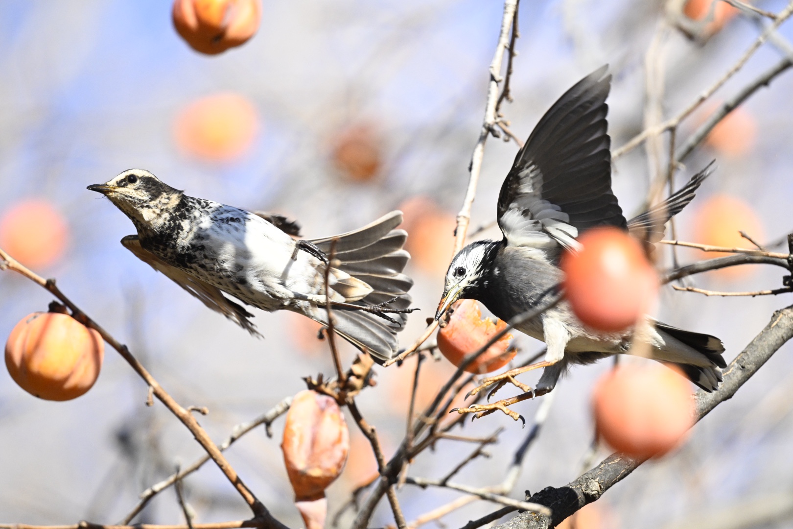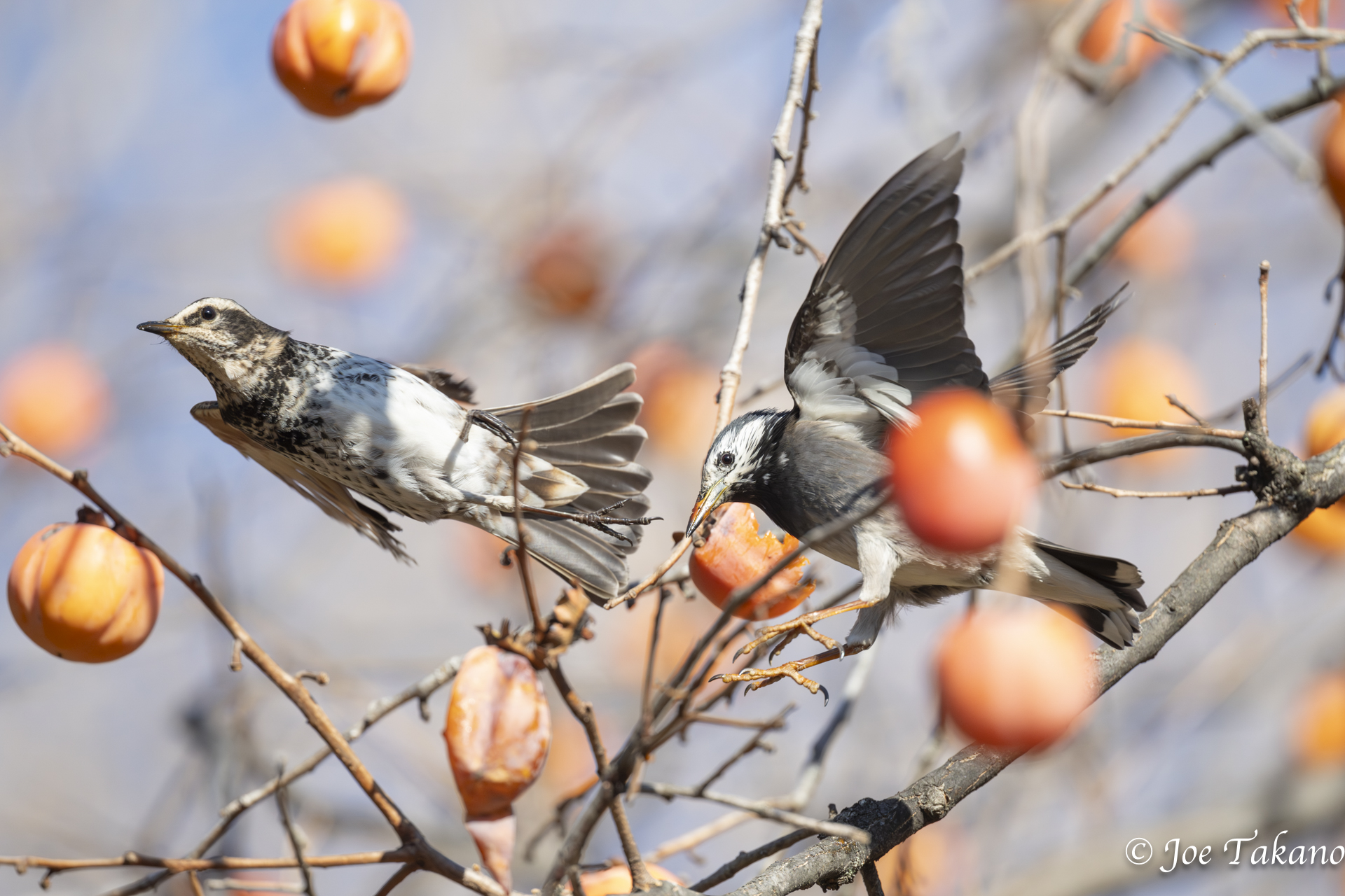 柿が食べごろのようで、メジロとツグミ、ムクドリが食べに来ていました。鳥たちは小競り合いするのですが、ムクドリが強く、ツグミを追い払います。メジロ同士はよくやりあっています。