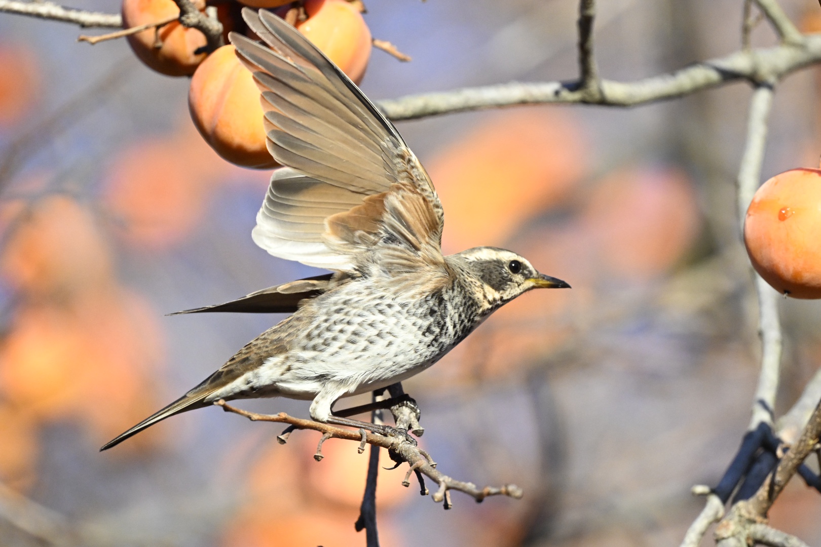 林のカキノキをツグミの群れが訪れていました。10羽ほどがそれぞれ熟した実をついばんでいます。ヒー ヒーという小さな声がレンジャクに似ていました。観察していると、ある程度食べたところで隣のヒノキに移り、休むという行動パターンがわかりました。目の前で食べている子の飛翔を狙って待ち構えます。食べ終わるきっかけはわかりませんが、ヒノキのほうを振り返ったのを見て、連写を始めました。飛び立ったツグミを追いますが、最初の飛行コースが予想よりも低かったため、画面内に入れ続けることができませんでした。実を食べていた個体がすべてヒノキに入り、カキノキレストランが一回転したところで、その場を離れました。
