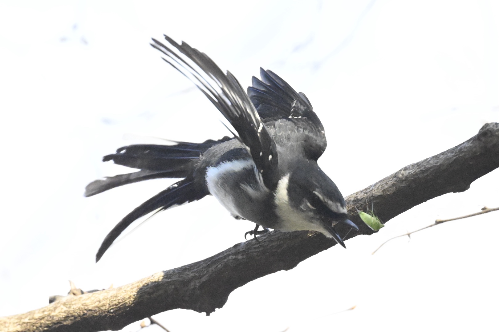 今日も仕事は残っていますが、少し時間をかけてまわりました。目立った収穫がないまま仲間に会うと、リュウキュウサンショウクイをよく観察できたといいます。周囲を見ていると無言で虫を探索しているリュウキュウが目に入りました。いい場所に出てくるのを待っていると、「髙野さん、隣にいるよ」と仲間の声。左を向くと、私が見ていたのとは別の個体がすぐ目の前にいます。あまりにも近いのでピントが合わず、ゆっくり下がってようやく撮影できました。愛用している663の最短合焦距離は4mなので、それよりも近かったことになります。リュウキュウはシラカシやツバキ、ヒノキなど常緑の木をハシゴし、カメムシやカゲロウ、クモを捕らえていました。シジュウカラのように足で稼ぐタイプとは異なり、とまった位置で頭を動かしてキョロキョロしながら虫を探します。このキョロキョロ、エナガの動きにそっくりです。また、ヒノキの葉の先のようにとまれない位置に虫がいる場合はホバリングして捕らえます。この動きはキクイタダキがよく見せますね。リュウキュウが虫をよく見つけては食べるようすを観察し、「温暖化ですよねー」と言う仲間たち。毎日よく観察しているので、どんどんレベルアップしています。わたしはリュウキュウの生態を間近で観察するのと同時に、飛翔も狙いました。飛翔撮影は今一つでしたが、捕らえたカメムシを落としてしまったリュウキュウが、慌てて空中で取り返した場面が傑作でした。落ちていくカメムシよりも速く急降下し、先回りして空中でキャッチしたようです。写真を見返すと、落ちゆくカメムシが置いていかれていました。食べるためとはいえ、鳥の能力はスゴイ!
