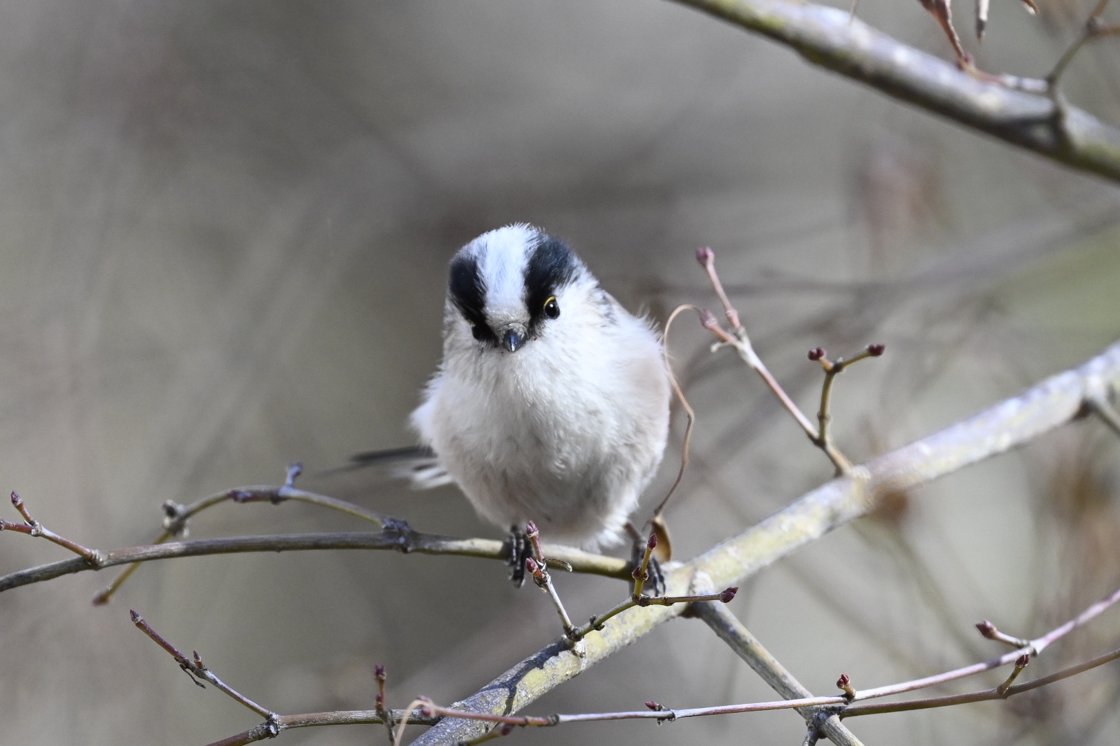 ビワカフェからカキノキに出てきたメジロ2羽が木の中に戻るのを観察し、イチョウの梢にとまっていたツグミが飛び立つのを撮影して林へ向かいました。風で鳥の動きがつかみにくい状況。遠くで複数の鳥が動く中、シロハラが降りるのを見つけて近づくと、すぐ足元からヒガラが飛び立ってヒノキにとまりました。遠くを見ていて足元の鳥を飛ばす……あるあるです。シロちゃんを確認し、池へ向かうとエナガの小群が低い位置に。北海道シマエナガ合宿を思い出しながら、動画をまわしました。ファインダーの中で目線をもらい、鳴き声も録れて一石二鳥でした。シマちゃんにはかなわないかもしれないけど、やはりエナガはエナガ。とてもかわいいのでした。静止画だったらいいのが撮れたのですが、それをいっているといつまで経っても得られないので、今日は動画でよかったのです。動画は講演や書籍で役立ちます。
