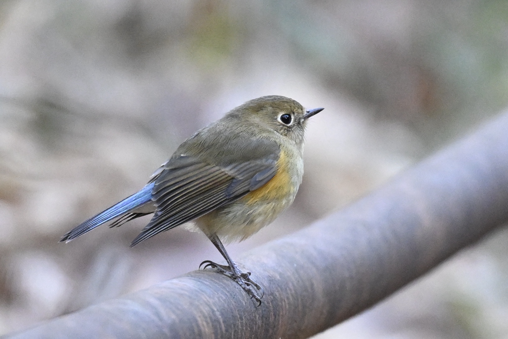 林の中心部を歩いていると、ギュッギュッという声が聞こえ、ルリビタキがいるのがわかりました。じっとしていると、柵の上にとまりました。明るい場所の設定になっていたので最初は撮り逃し、次の機会を伺います。ルリ子の再登場をじっと待っていると、メジロが現れてすぐ目の前のシラカシの幹にとまりました。経験的に、樹液をなめにきたことのだとわかります。ところが私が立っていた位置がかなり近かったので、しばらくこちらをじっと見たあと去っていきました。ごめんごめん。メジロが樹液をなめるときは、結構神経質になります。木の幹を向くので、無防備になるのでしょう。再び現れたルリ子は、シジュウカラとともに地上に降りて食べ物を探していました。そのうち低い柵の上にとまったので、今度は記録しました。肩のあたり青みがある?ルリ子と書きましたが、オスの若鳥かもしれません。