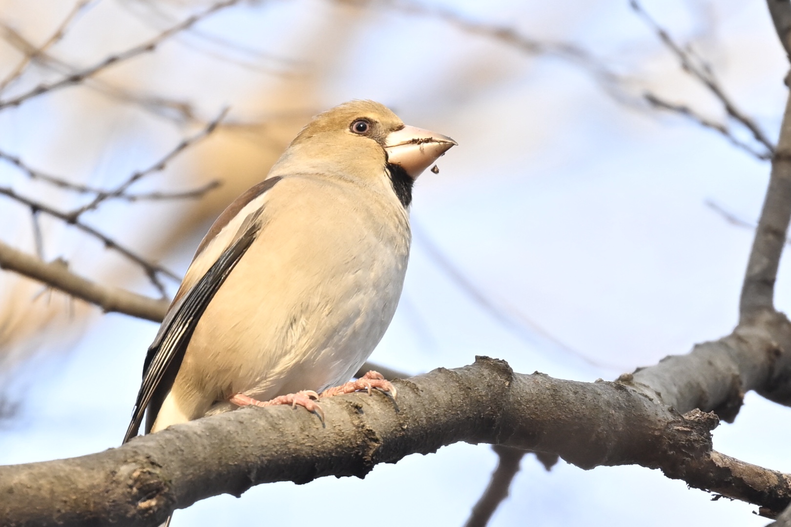 リュウキュウサンショウクイの声を聞きながら探索を進めると、シロハラがガサガサをやっていました。樹上にはシメがとまっています。嘴が汚れていること、とまっているのがエノキであることから、わずかに残った実を食べていたことがわかりました。周囲に実が残っていないので、飛ぶと予測して飛翔撮影モードに。シメは飛び立ちましたが、枝に阻まれて撮れません。林の泣きどころですね。