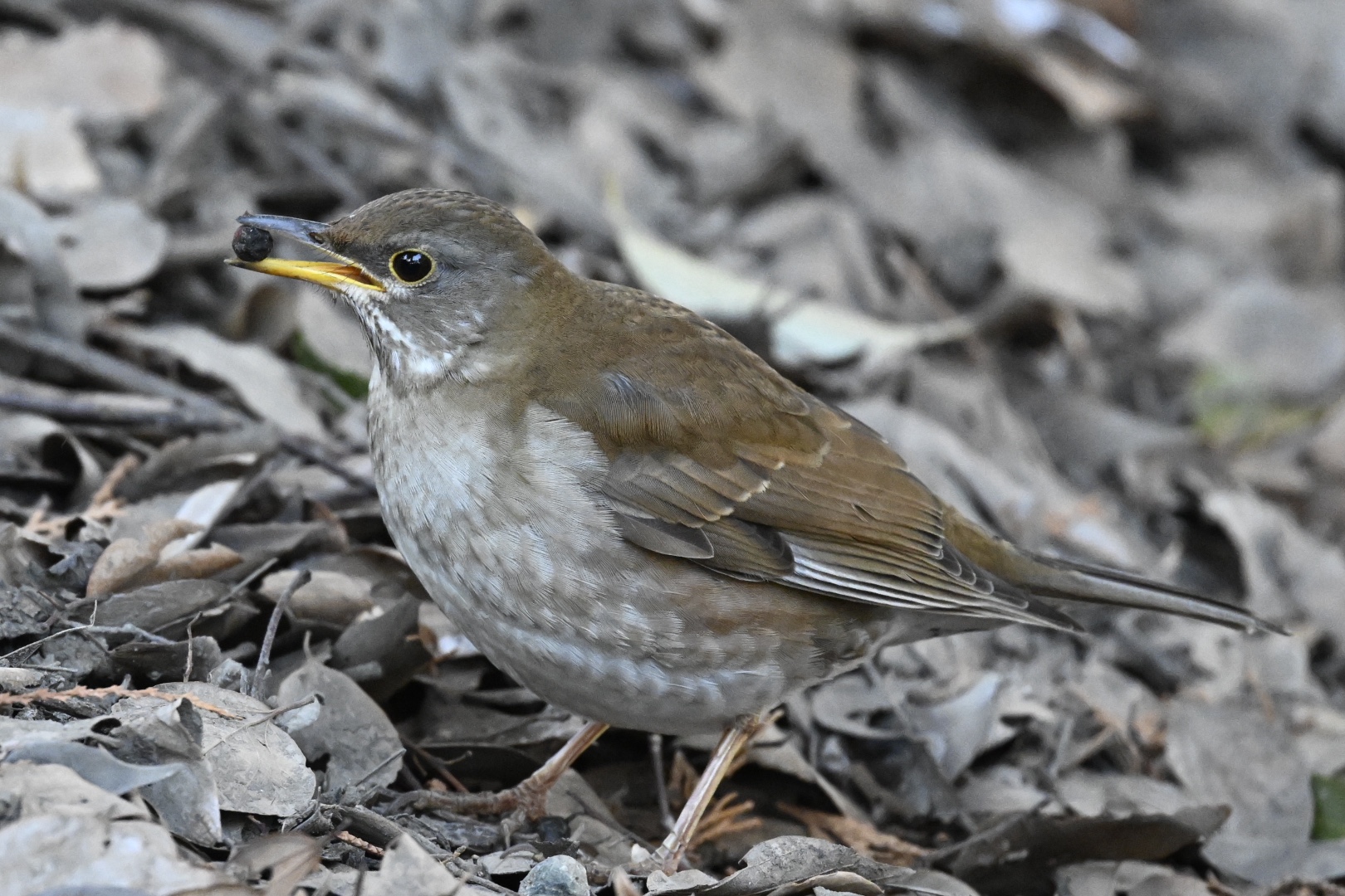 最初の観察地では、ツグミも鬼ごっこをしています。今朝は上空を飛ぶ個体が少なめでした。ヤマガラが地上に降りて、なにが探していました。エゴノキの根元なのでわかりやすい行動です。実を見つけて樹上に上がり、トントントンと殻をつついて割り、食べていました。シメの動きは目立ち、鬼ごっこもよく見られました。食べ物が少なくなってきて、競争が激しくなっているのかもしれません。樹上に残ったイロハモミジの種子を食べたり、地上に降りて落ちている種を拾ったりしていました。シロハラは明るい場所に出てきて、ガサガサをしています。人が近くを通るといったん樹上に上がりますが、すぐにまた降りてきます。エノキ以外の実も食べているようでした。