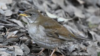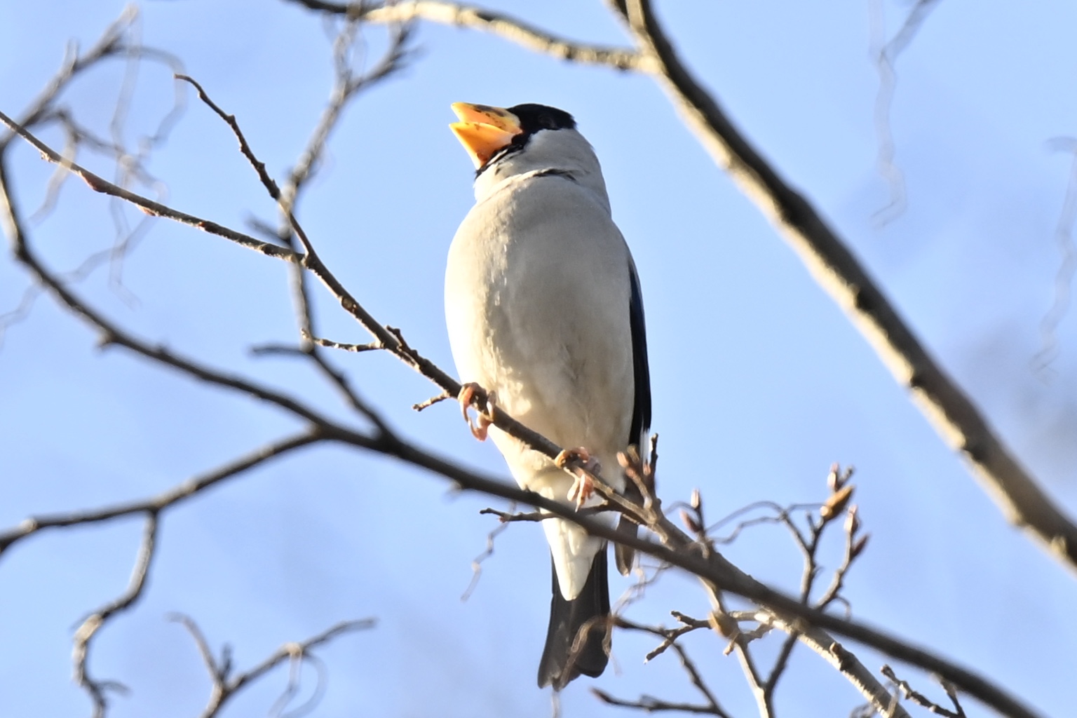 寒さで公園に出てくる人が少ないからか、鳥たちは園路によく出てきます。林をゆっくり進んでいると、ルリ子とご対面。あまりにも近いので、かえって撮影できませんでした。それでも、じっとしながらお互いに見つめ合う時間は至福の時。ルリ子の尾羽だけが上下に動くのでした。シロハラは園路でガサガサをやっています。水路ではツグミ3羽がなかよく水を飲んでいました。カワラヒワの中にシロちゃんは見つかりませんでした。時間がなくなり足早に池へ向かう道中、イカルの澄んだ美しいさえずりが聞こえました。イカルは群れで行動しますが、今朝の子は1羽のみ。高木の梢でさえずっています。飛翔を待ちましたが、落ち着いているようで、すぐには飛びませんでした。池は相変わらずがらんとしています。