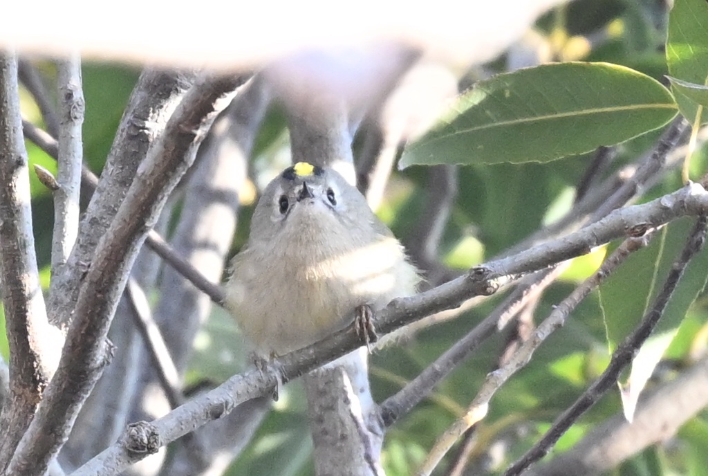 探索を進めると、ジジジジというキクイタダキの声が聞こえました。スギとサワラあたりにいるに違いないのですが今朝は風が強く、混んだ枝葉が揺れる中に、日本最小の鳥の影を見出すのはなかなか面倒なことです。ようやく姿を捉えたと思ったら、後ろからも声が聞こえます。シラカシの梢近くに姿を見つけ、記録写真を撮るやいなや、キクちゃんはスギにいた個体に合流しました。全部で3個体いたようです。しばらく撮影を試みましたが、時間がなくなったので、仲間にバトンを渡して観察を終えました。