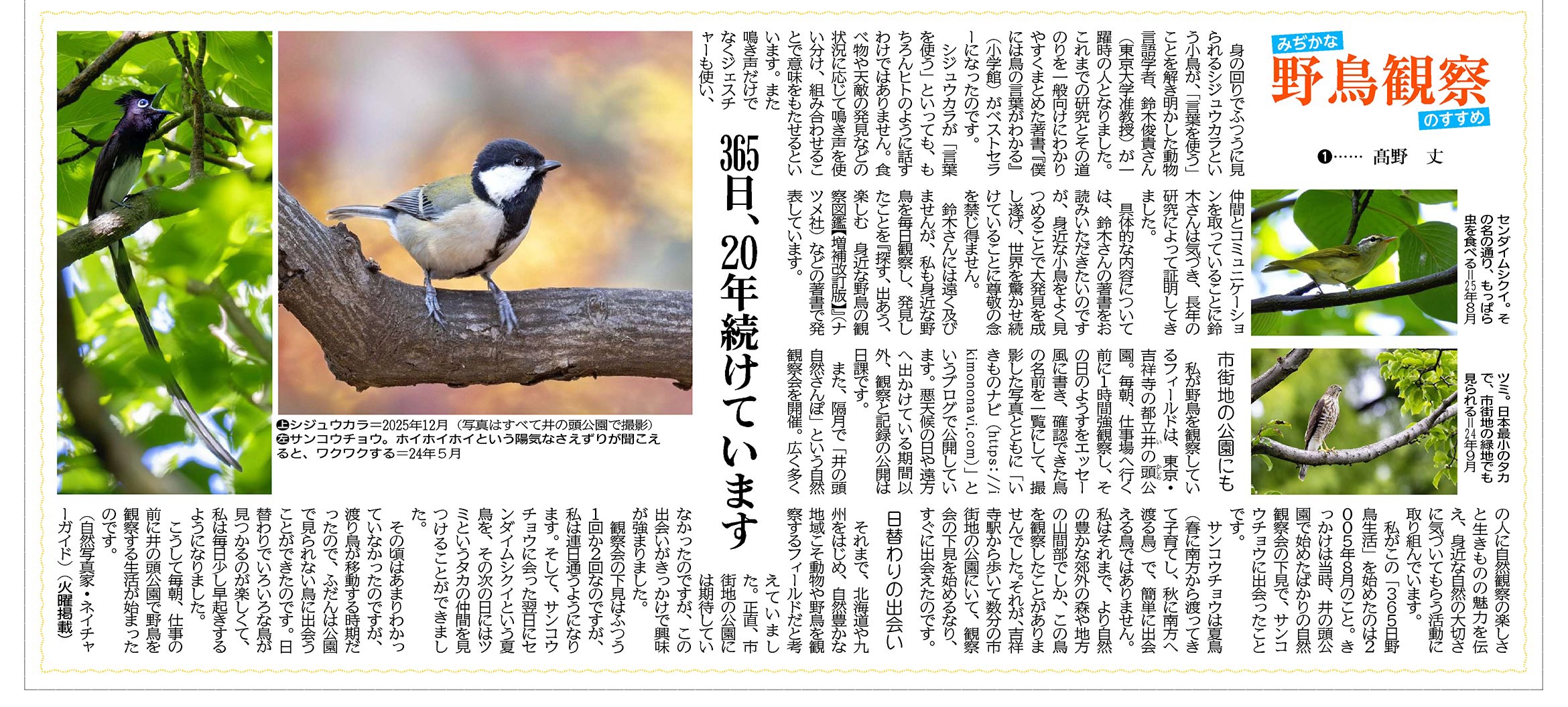 2026年初め、しんぶん赤旗に全4回の連載エッセイを寄稿しました(2026年1月6日、13日、20日、27日)。テーマは「みぢかな野鳥観察のすすめ」。井の頭公園での身近な野鳥観察を軸に、私が「365日野鳥生活」をするようになったきっかけや、実際に観察した野鳥の興味深い生態を写真とともに紹介しました。自分の過去や、現在取り組んでいる活動の意味をおさらいすることにもなり、貴重な機会をいただきました。新聞は印刷線数が少ないのでふつう印刷が粗くなるのですが、きれいなカラー印刷だったので安心しました。