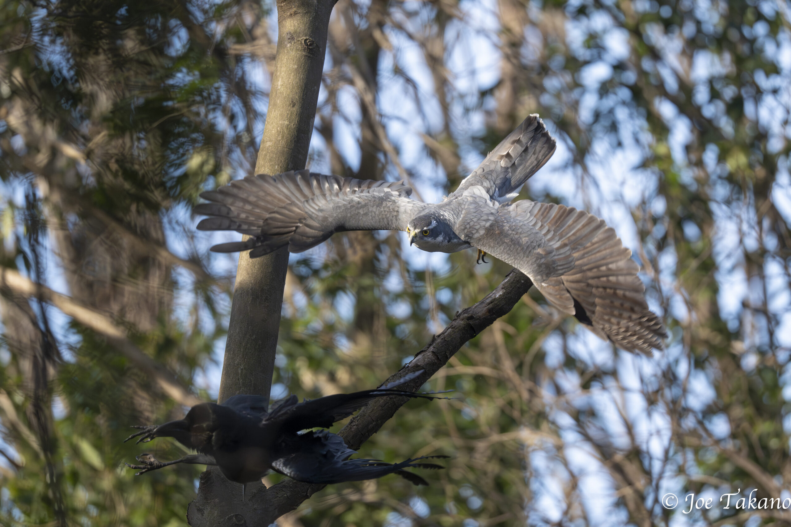 林の中心部には仲間がいて、オオタカがアオゲラを襲ったという話をしてくれました。狩りは成功しなかったそうですが、さっき聞こえたのは襲撃のときの声だったのでしょうか。果たして、観察定点の一つにオオタカがとまっていました。大きさや眉斑の太さから、タカオのようです。タカオは羽づくろいをするなど、リラックスしているようでした。飛翔を撮影するために待っていると、2羽のハシブトガラスがやってきました。タカオははじめ無視していましたが、近づいてきた2羽に挑発されると、飛びかかりました。これが三度繰り返されると、面倒になったのか少し離れた場所まで飛んでいきました。