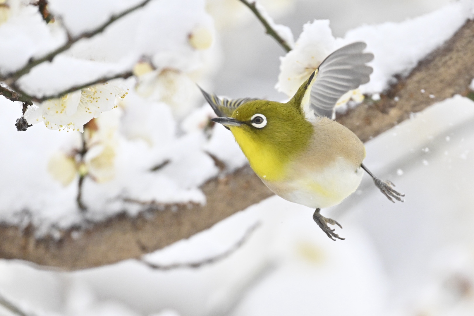 池のほとりに降りると、雪が積もったウメの花にメジロが一羽きていました。蜜をなめにくそうな状態でしたが、器用に次々と花を訪れ、蜜をなめていました。