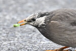 風が冷たい朝でした。住宅地を進むと、ムクドリが路上で何かをついばんでいます。背後から車の迫る音が聞こえたので、慌てて写真を撮りました。ムクドリの写真を撮るというより、ムクドリが何を食べていたのかを記録したいという思いです。緑色が見えた時点で気づかなければならなかったのですが、ムクドリがついばんでいたのはカメムシでした。例のツヤアオカメムシでしょうか。今シーズンとてもよく見かけ、リュウキュウサンショウクイからシジュウカラまで、いろいろな鳥が食べています。