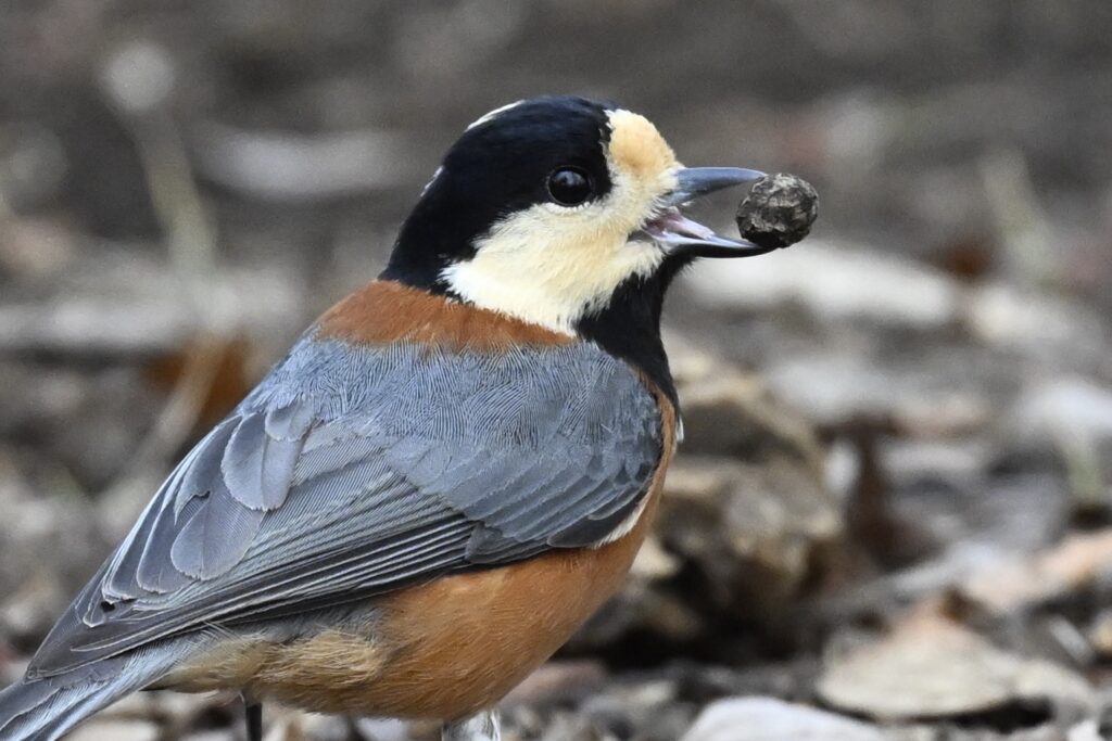 最初の観察地では、ヤマガラがエゴノキの実をせっせと食べています。地上で拾い、樹上で割って食べます。何日も何日も繰り返し採食するようすを見ると、エゴノキの大切さを強く感じます。ヤマガラの奥でガサガサをしていたツグミが、急に奇声を発して樹上に上がりました。モズが飛んできたので、警戒したようです。尾を回していたモズは地面に降り、再び樹上に上がりました。その後、敷地外に飛んでいってしまいました。