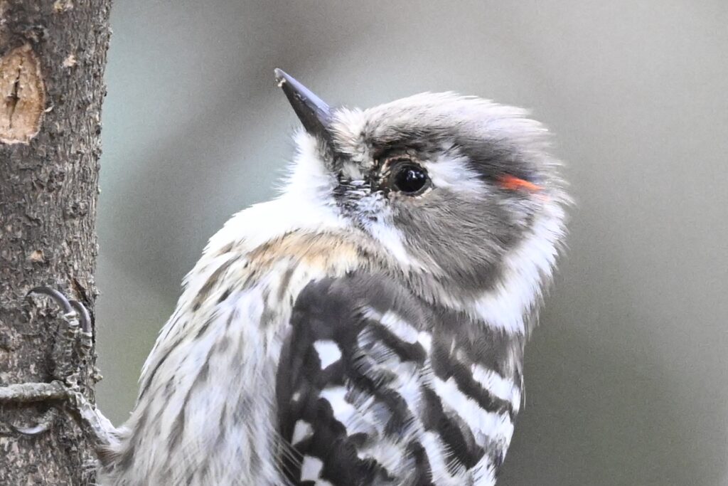 「ステージ」の前で出演者を待ちましたが、今朝はタイミングが合いませんてした。探索を進めると、コゲラが低い位置にいます。ファインダーを覗くと、後頭の赤い羽がばっちり見えました。風や逆立てたことで見えたのではなく、見えっぱなしです。以前もこの時期に「見えっぱなし」の個体がいました。頭部の羽が薄くなる時期なのでしょうか。図鑑用によい写真が撮れました。