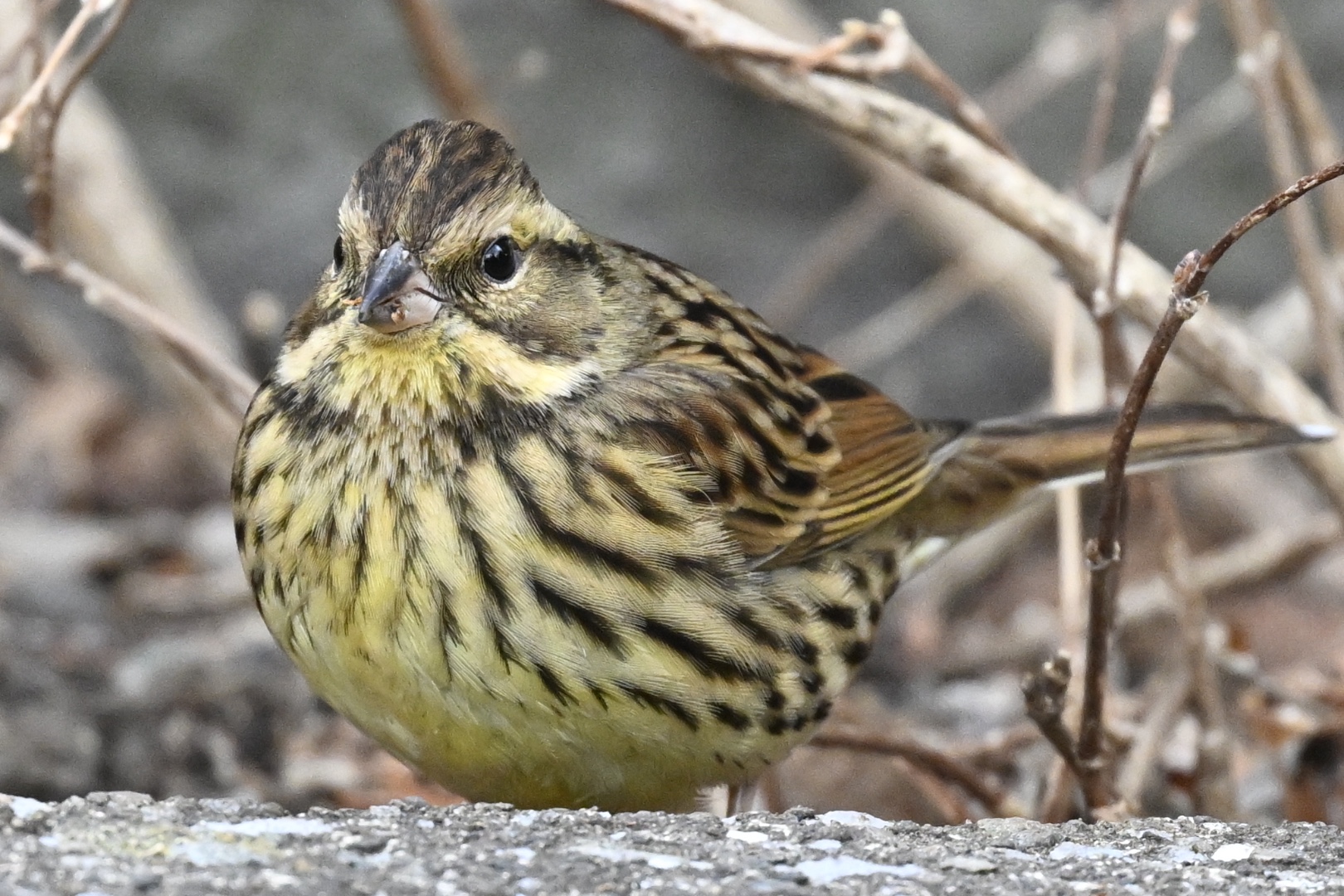 オオタカはオスがヒモ状態なのですが、メスが呆れていなくなるのっはと心配になってきました。カワラヒワの群れにシロちゃんは見つからず、池に降りていくと、ジッ ジッの声。振り返ると、花壇にアオジがいました。