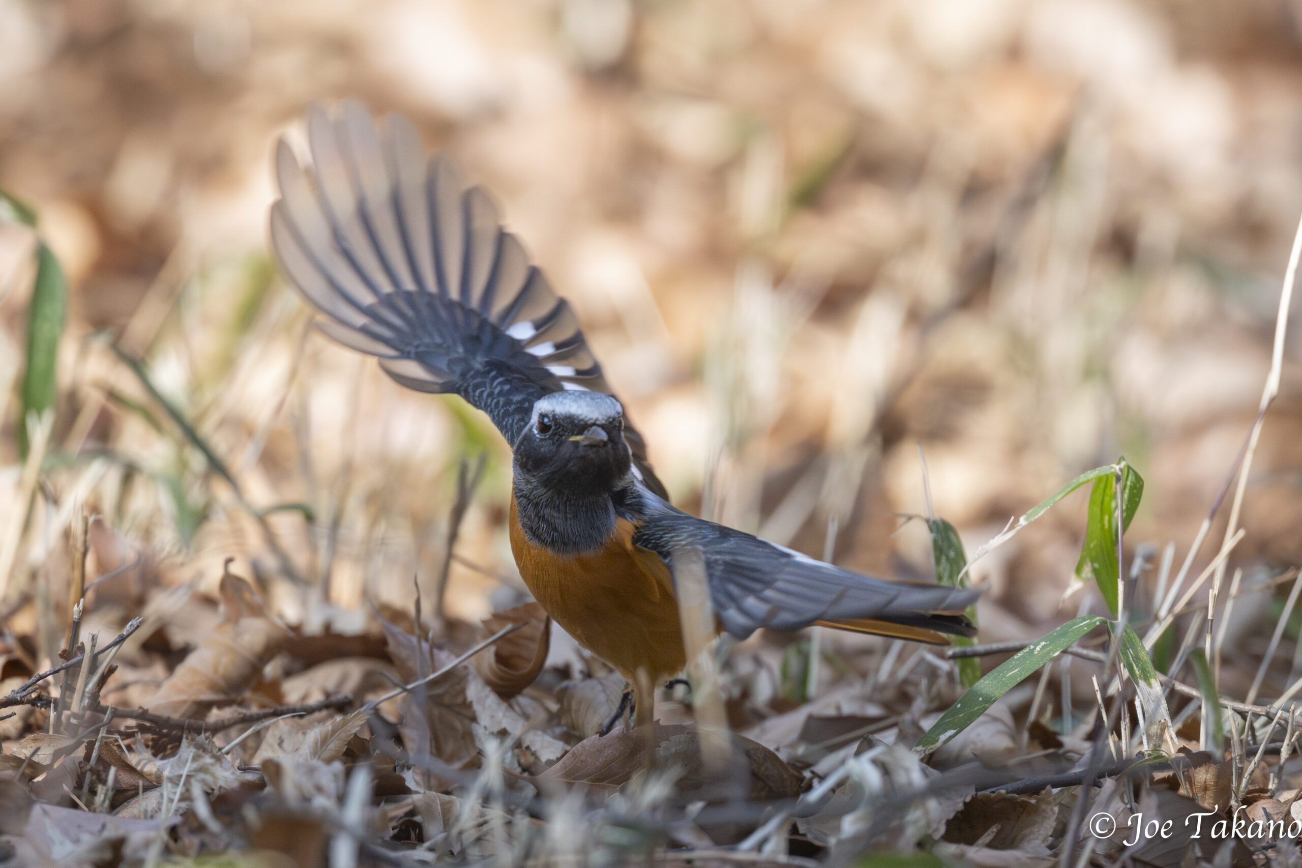探索を進めると、久しぶりにジョウビタキのジョビ男がお出ましです。人馴れしているのか距離が近いので、通行人がスマートフォンで撮影していたという噂も聞きました。ジョビ男は何回も地上に降り、採食する動きを見せてくれました。