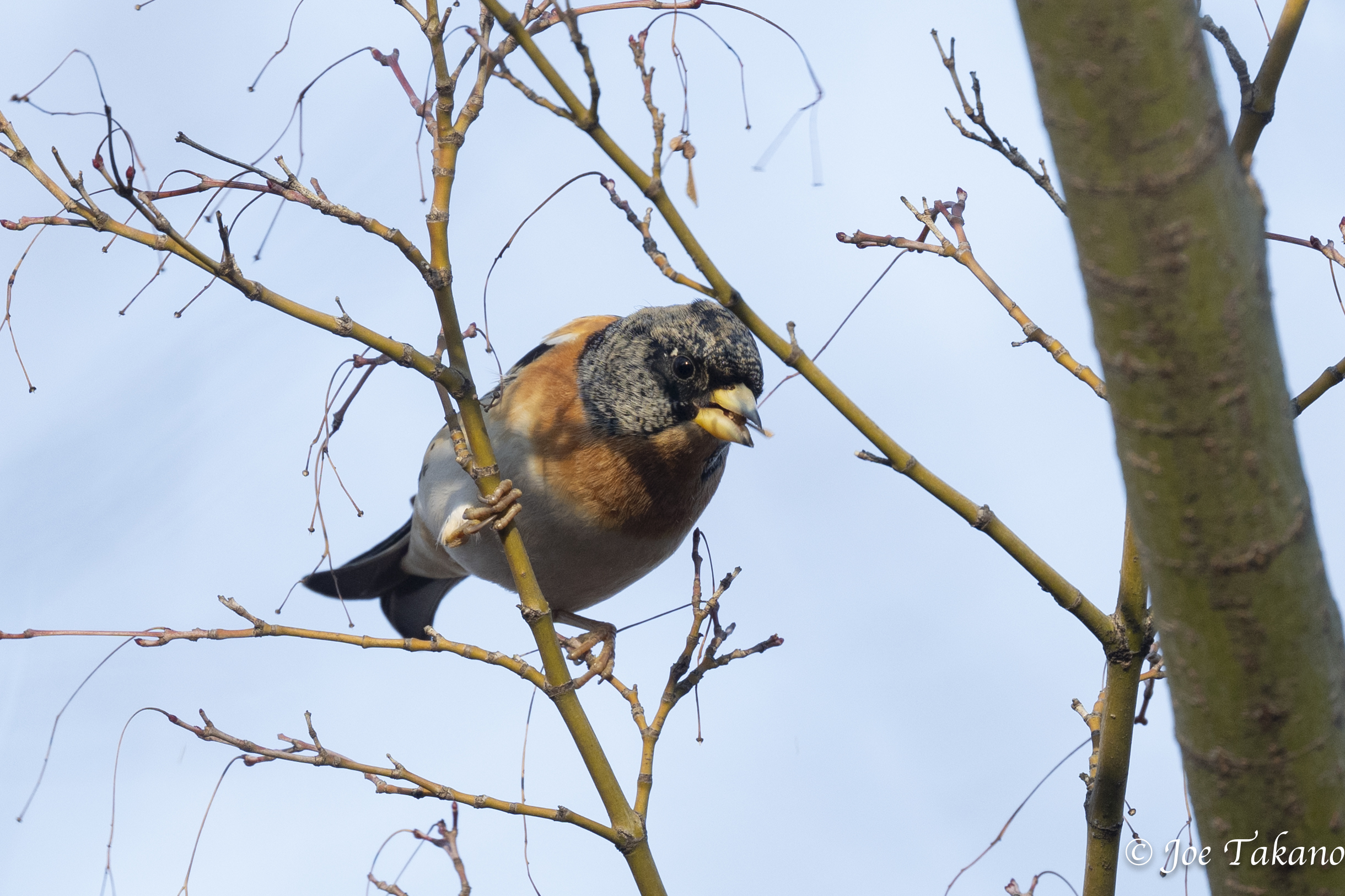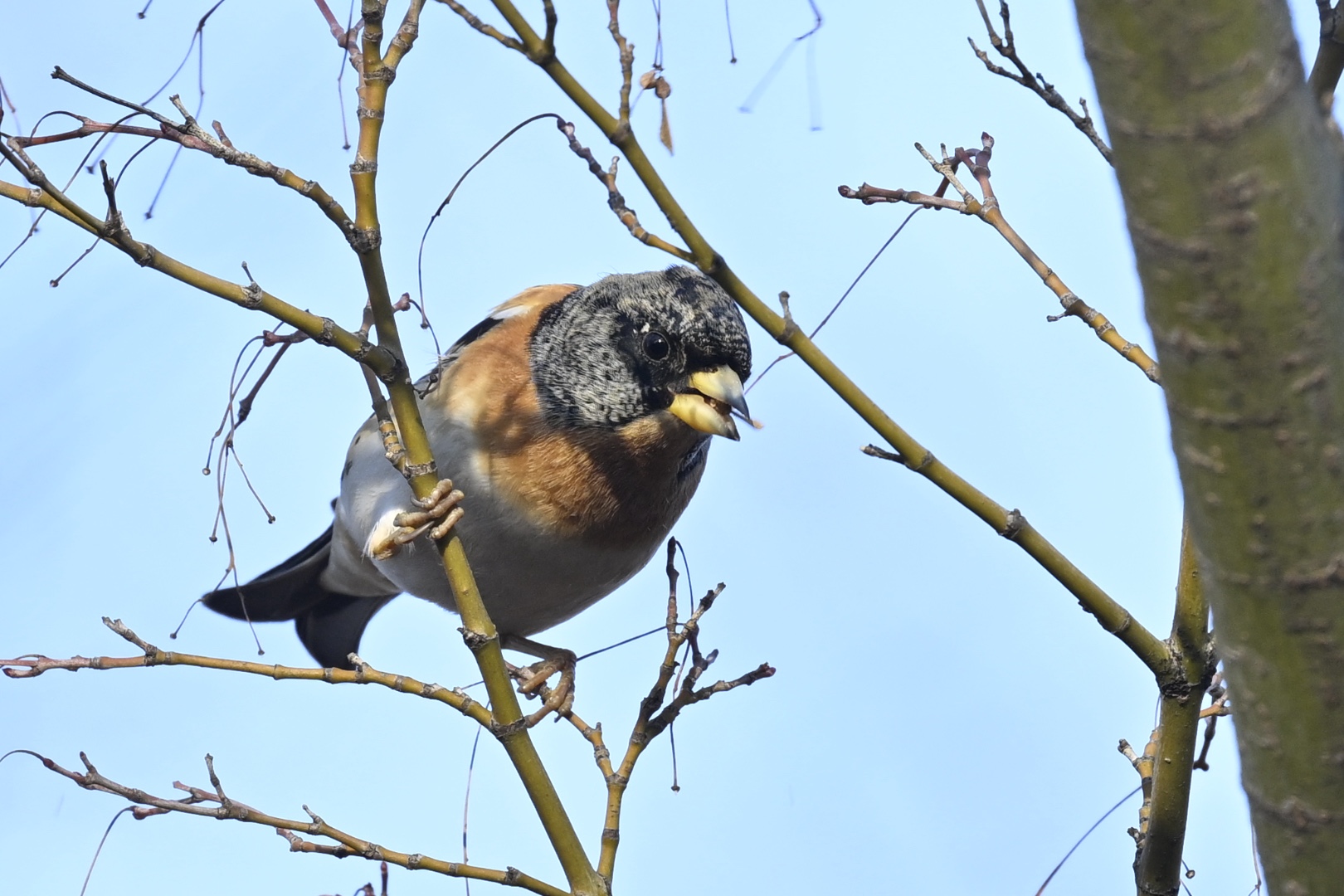 今朝もアトリに出会いました。最初の観察地に入って立ち止まり、周囲に目を凝らしていると、フニフニフニと鳴きながら1羽の小鳥が飛んできます。スズメより少し大きく、尾の先が逆Y字です。双眼鏡で確認するまでもなく、アトリだとわかりました。アトリはしきりにキョロキョロしています。とまっている木を見るとイロハモミジで、枝先にわずかに残っている実を食べ始めました。食べるのに夢中過ぎて、そっと近づいてもまったく警戒しませんでしたので、ゆっくり観察できました。当たり前なのですが、近くに実があるときは体を伸ばして採食します。そして、周囲に実がなくなると場所を変えます。耳を澄ますと、種を砕くときのパキッという音が聞こえます。種をくわえとってから「パキッ」までに間があるのは、シメと同じ。口の中で種を転がし、割れやすい位置を探っているのでしょうか。アトリはひとしきり実を食べると、飛んでいってシラカシの暗がりに入りました。しばらく木陰で羽づくろいでもして、再び出てくるのでしょう。ヤマちゃんは今朝もエゴノキの実を地上で拾い、食べていました。