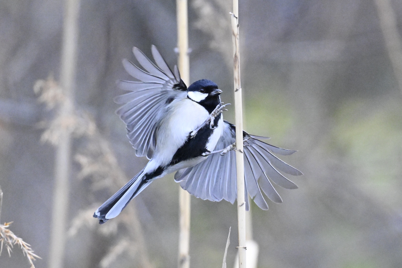ガサガサをするシロハラとツグミを何か所かで確認しながら池へ降りていきます。一見するとカモがいないように見えますが、倒れたヒメガマのベッドで眠っているマガモ、ハシビロガモ、ヒドリガモに気づきました。1羽のシジュウカラがヨシの茂みに入ってきて、茎につかまり皮をむいていました。カイガラムシでしょうか、中の虫を食べているのでしょう。どの鳥も一生懸命。虫が動き始める春を待ち焦がれています。