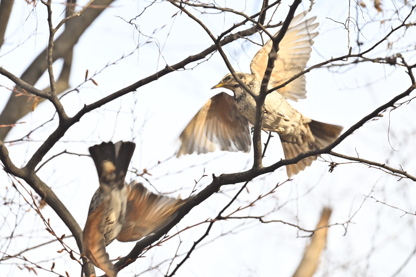 最初の観察地へ入ると、滑空してきたモズをツグミが追い払う場面が遠くに見えました。もう一度モズがアタックするかもしれないので構えて待ちましたが、ありませんでした。ツグミは樹上に上がらず、地上にいます。ところが周囲を巡回したモズが再度滑空してツグミのほうへ。今度もツグミに撃退されましたが、木々の向こうだったので撮影できませんでした。モズはケヤキを上がっていき、高い位置にとまります。周囲にはシジュウカラ数羽とメジロ、コゲラがいますが、不思議とモズに対して反応しません。絶対に気づいていないはずはないのに。モズはシジュウカラを追い散らし、大きなシラカシを上がっていって梢にとまり、高鳴きしはじめました。今回はツグミやシジュウカラを獲物として狙ったのではなく、なわばり争いの相手としてかかっていったのでしょうか。ツグミは動じていないようでしたが、樹上に上がりました。すると、すぐ近くに別のツグミがとまります。2羽でモズに対抗する?と想像し、写真を撮っていると、後から来たほうがもう1羽にかかっていきました。バシッという音が聞こえ、かかっていったツグミは跳ね返されます。モズに対抗する共同戦線などあり得ないことに気づき、飛翔撮影の設定にして「2回戦」に備えました。邪魔な枝が多く、撮影位置に頭を悩ませます。ツグミたちに警戒されない距離を保ちつつ、できるだけ枝が邪魔にならない位置を考えて待ちました。次の瞬間、2羽の闘いが始まります。やはり最初のカットは手前の枝にピントがもっていかれました。その後の3カットのうち、2カットはピントが合いましたが、地上に落ちていく2羽を無念のフレームアウト。林内撮影の不利さを痛感しました。その後2羽は距離を取ってガサガサをするも、次第に距離が近づいていきます。3回戦があると読んで、じっと「その時」を待ちましたが、2羽はまた離れていきました。今朝の取組はここまでということで、探索を再開。モズはいなくなっていました。