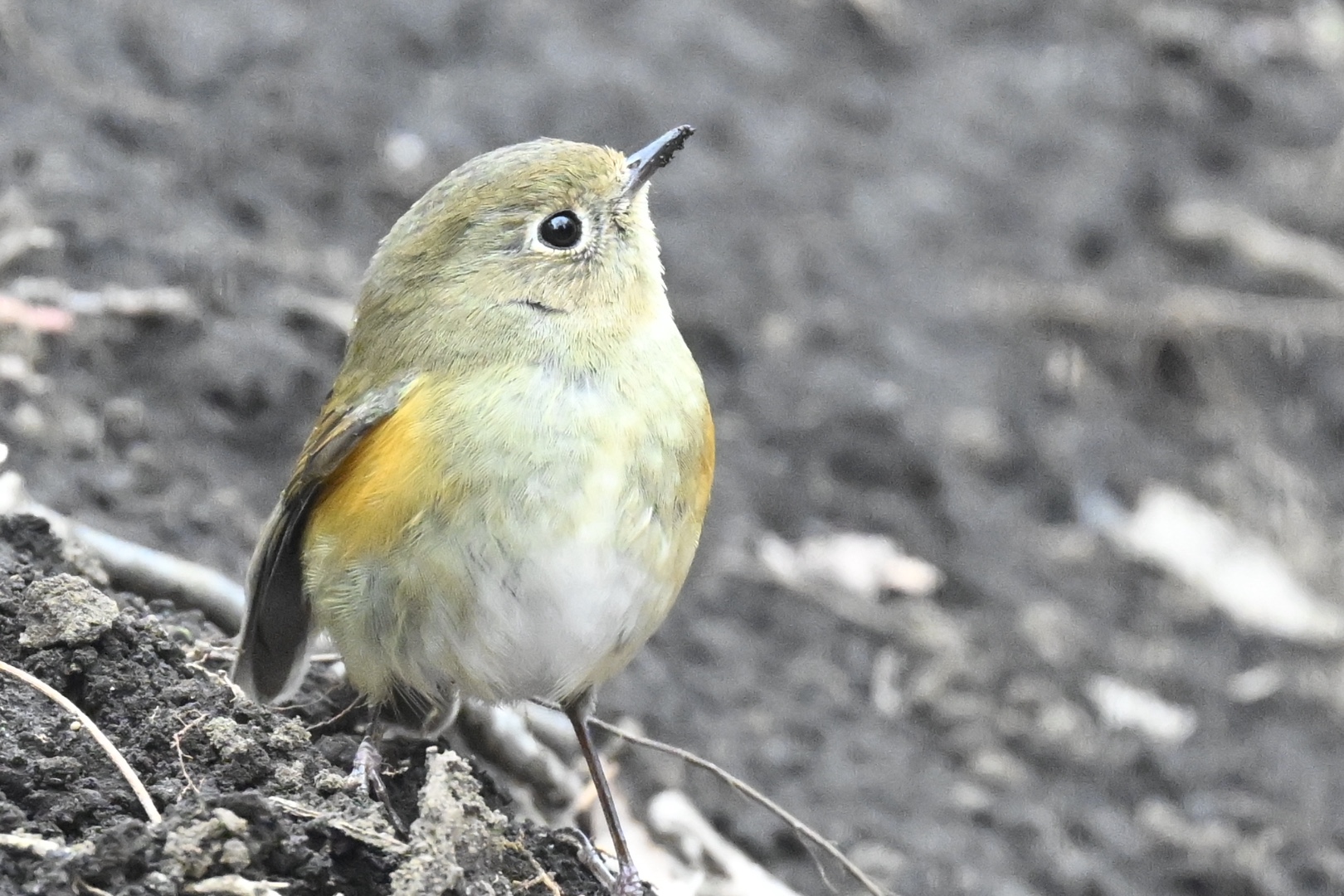 「舞台」の前で静かに待っていると、下手からルリビタキが現れました。やや色黒で山吹色の部分が広いのでルリ美です。久しぶりに出会いました。ルリ美は尾を上下に振ってから地上に降り、ぴょんぴょん跳ね歩いて食べ物を探しています。ヤマガラやシジュウカラも登場し、舞台はにぎやかになってきました。そのとき、エナガやシジュウカラが警戒声を出しました。ルリ美も反応し、動きを停めて上空を見上げています。オオタカでしょうか、少し前からはっきりわからないくらいの声が散発的に聞こえていました。ルリ美はしばらく見上げたまま固まっていましたが、しばらくすると楽屋へとさがっていきました。固まっているようすが、かわいかったなぁ。