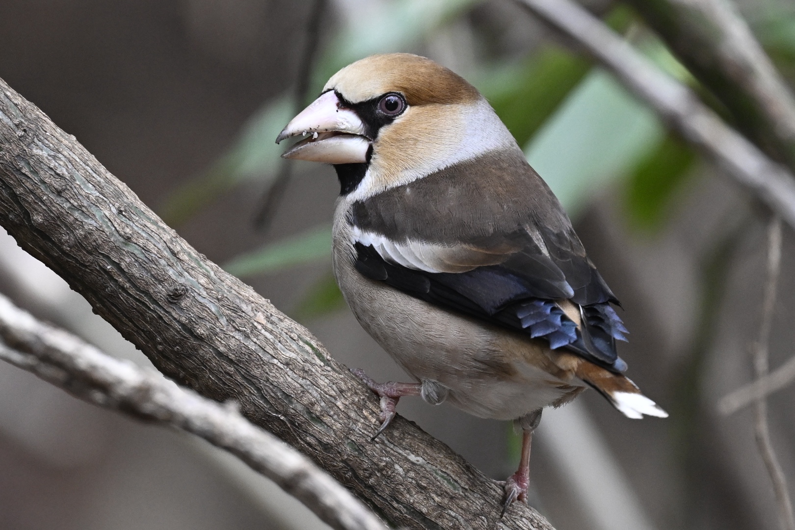 林を歩いていると、リュウキュウサンショウクイが3羽飛んでいきます。「舞台」ではルリ子とルリ美を見かけませんでした。シロハラ2羽がガサガサをしていて、シメも下に降りています。初列風切の美しい青色とユニークな形をじっくり観ることができ、あらためて見とれてしまいました。いつかこの個性的で美しい羽を拾ってみたいものです。