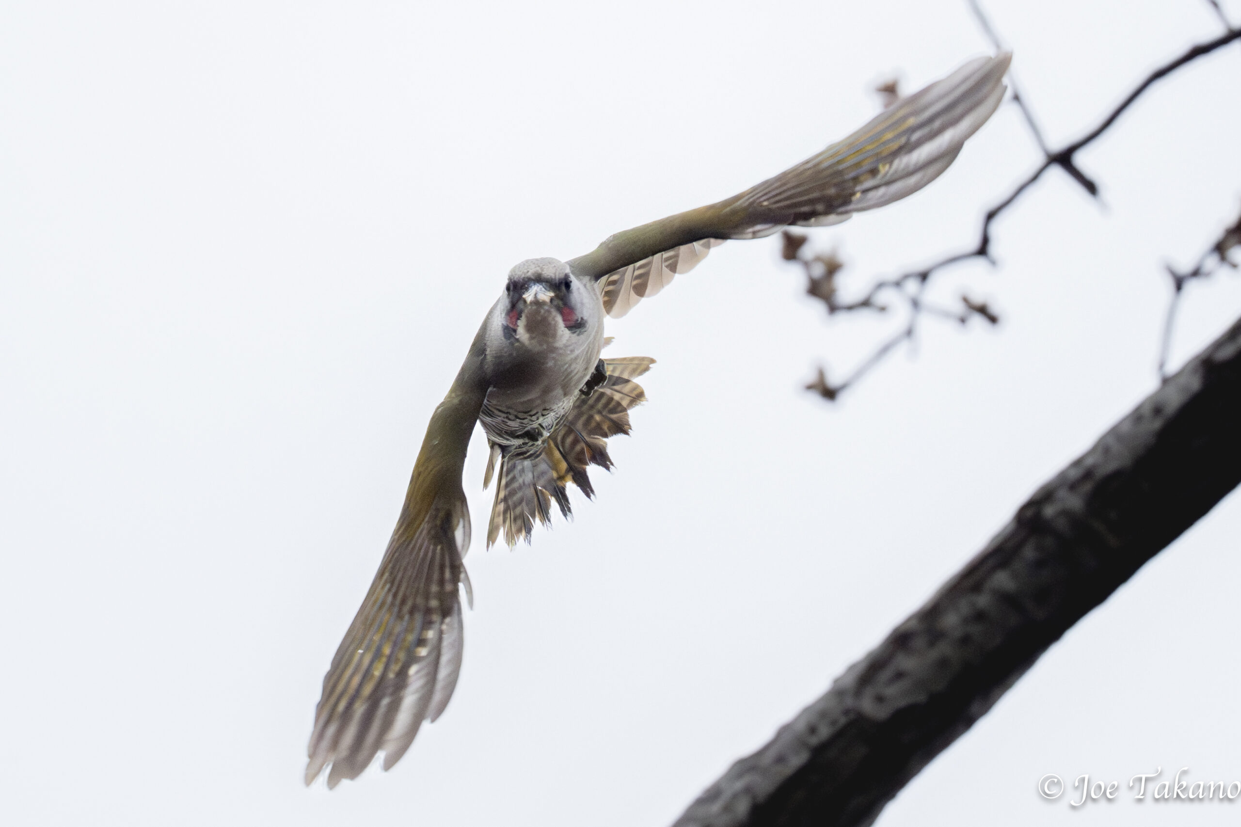 天気は下り坂で、朝からどんより曇っています。最初の観察地に立ち、周囲を確認しました。いつものツグミが動きを停めてこちらを見ています。アオゲラのフィー フィーという声が遠くから聞こえました。ほどなく、深い跳躍飛行で飛んできて大コナラにとまった中型の鳥。無言でしたが、先ほど遠くから聞こえていた声、大きさ、飛び方、とまり方などを総合してアオゲラだと見当がつきました。そして、とまった枝は折れていて先がないことから、すぐさま飛ぶことが予想されたので、カメラが飛翔設定であることを確認し、備えます。案の定、アオゲラはレンズを向けて3秒後に飛び立ったので連写。正面向きだったので被写体検出がうまく働きませんでしたが、一連の動きの予測が当たったのでよしとしましょう。