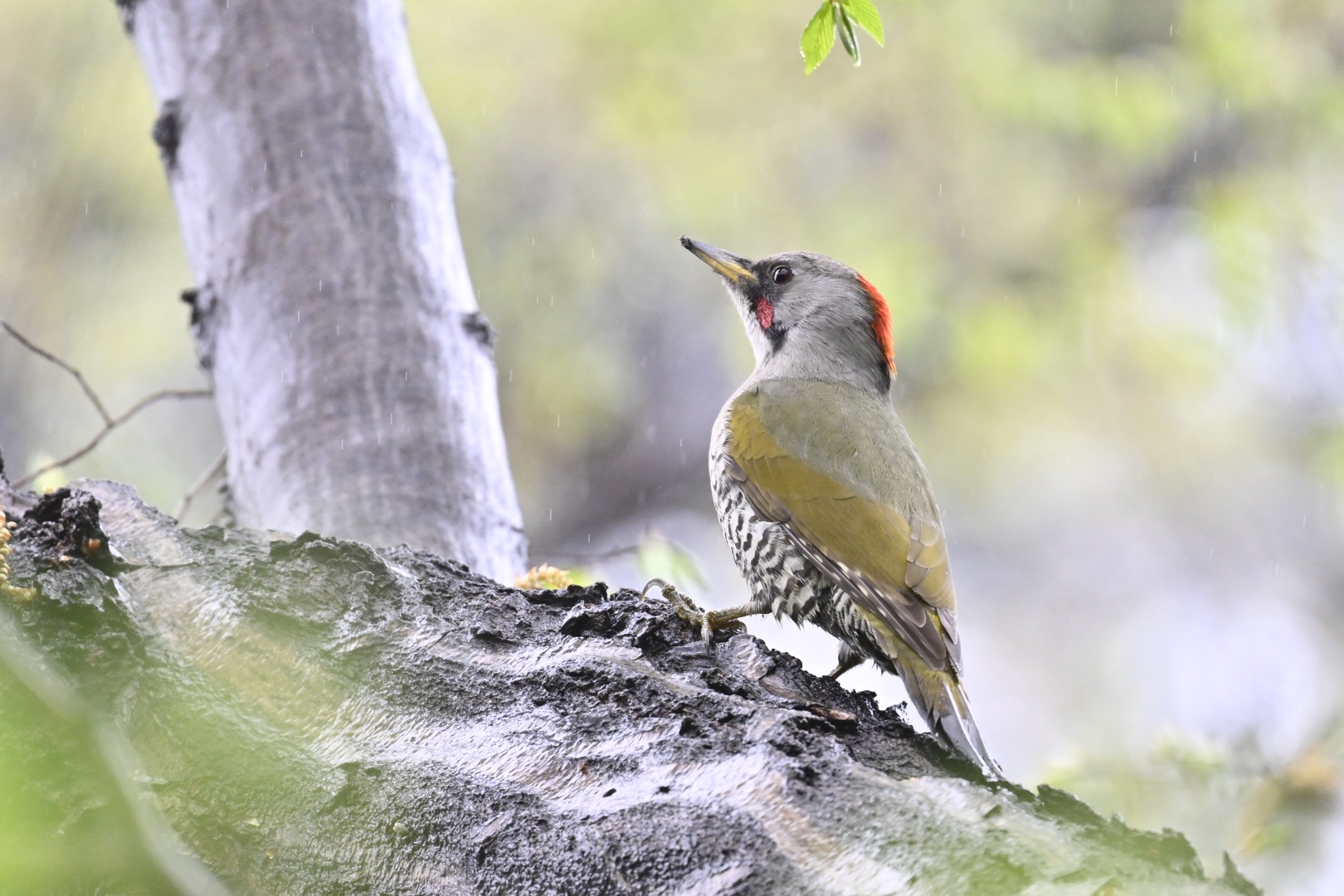 キョロンキョロンという声が聞こえたので視線を上げると、イヌシデの横枝にシロハラがとまっています。傘をそっと置き、レインカバーを外そうとゴソゴソしている間に、シロハラは枝移りし、移動してしまいました。こればっかです。アオゲラの声が聞こえたので、気を取り直して探しにいきました。見つけたのはメス。やはり今、井の頭公園にいるアオゲラは、メス1羽だけみたいです。ピョー ピョーと鳴いて婚活しても、相手がいないのでは無意味。近隣のフィールドには複数個体がいて、繁殖も進んでいるようなので、あぶれたオスが来てくれないかなと期待してしまいます。