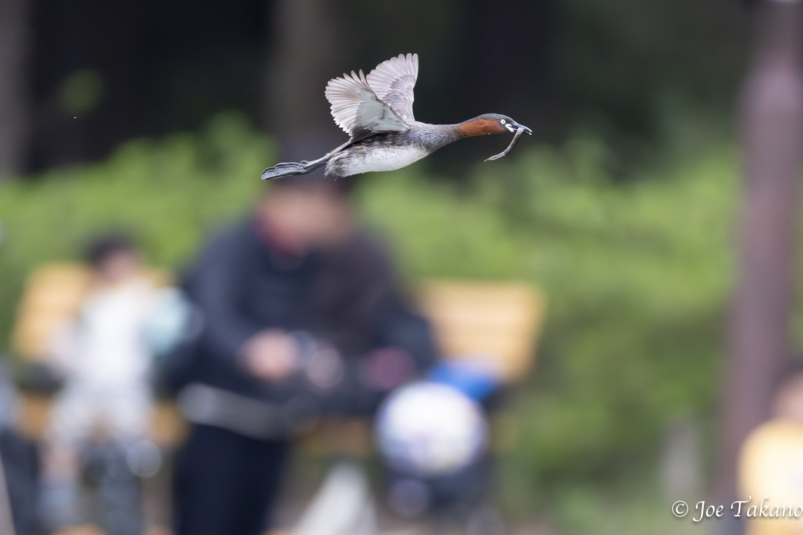 花見の人が増えてきた七井橋を渡っていると、カイツブリが飛んでいました。もちろんカイツブリも飛びますが、なわばり争いのときに水面すぐ上を飛んでいるのか滑っているのかくらいの、中途半端な飛行が普通です。今日見たのはカイツブリにしては高い飛行。しかもヌマチチブのようなものをくわえながらです。思わず、「え?なんで?なんで?」と声を出しながら飛翔撮影しました。謎です。この個体、お茶の水池から七井橋を越えてボート池に降りました。井の頭公園のカイツブリを毎日20年以上見ていますが、最も高い飛行です。「朝撮りの観察」として、午後の講演の締めくくりに披露しました。