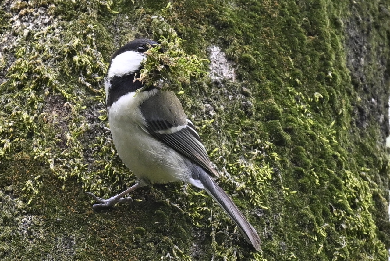 そのシジュウカラが、エノキの樹皮についたコケをこそげ取り、たっぷりくわえて飛んでいきました。